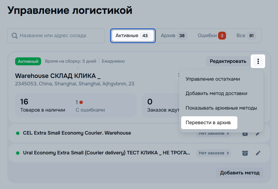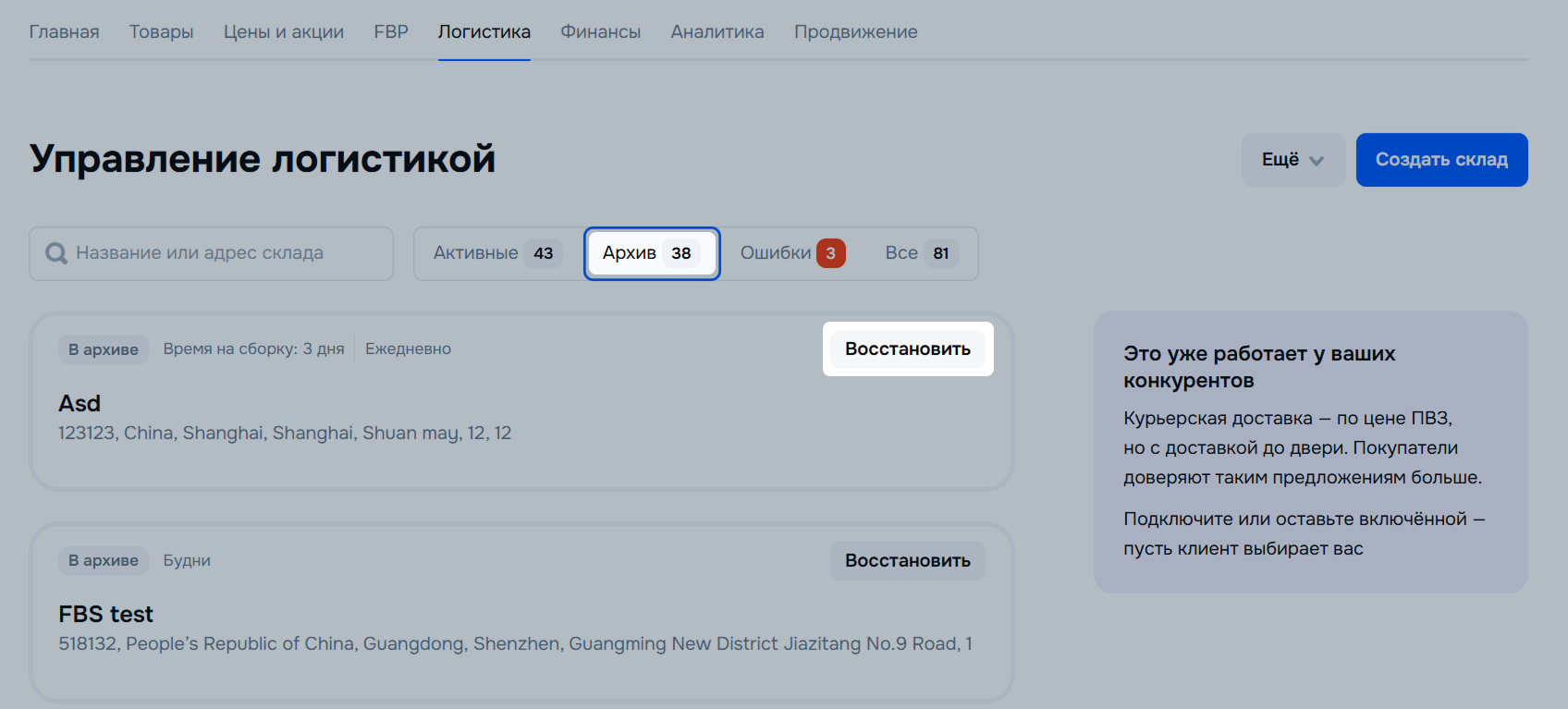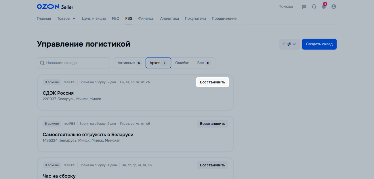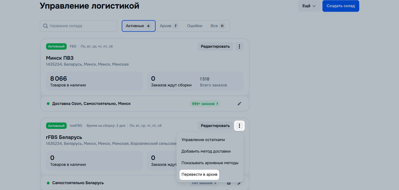 Когда на складе не останется заказов в статусах Ожидает сборки, Ожидает отгрузки и Доставляется, вы сможете перенести его на вкладку Архив. При необходимости вы сможете вернуть склад в работу.