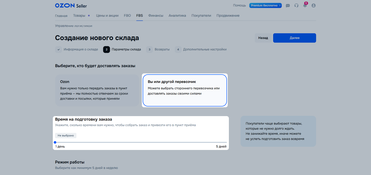 Режим работы. Добавьте минимум 5 рабочих дней в неделю. Если ваш склад будет работать в праздничные дни, отметьте их. Нажмите Далее.
