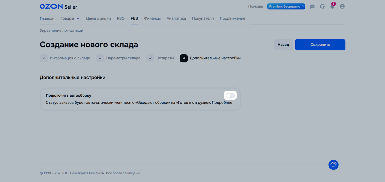 Чтобы получать возвраты на склад, с которого отправляются товары, включите Совпадает с адресом вашего склада.
