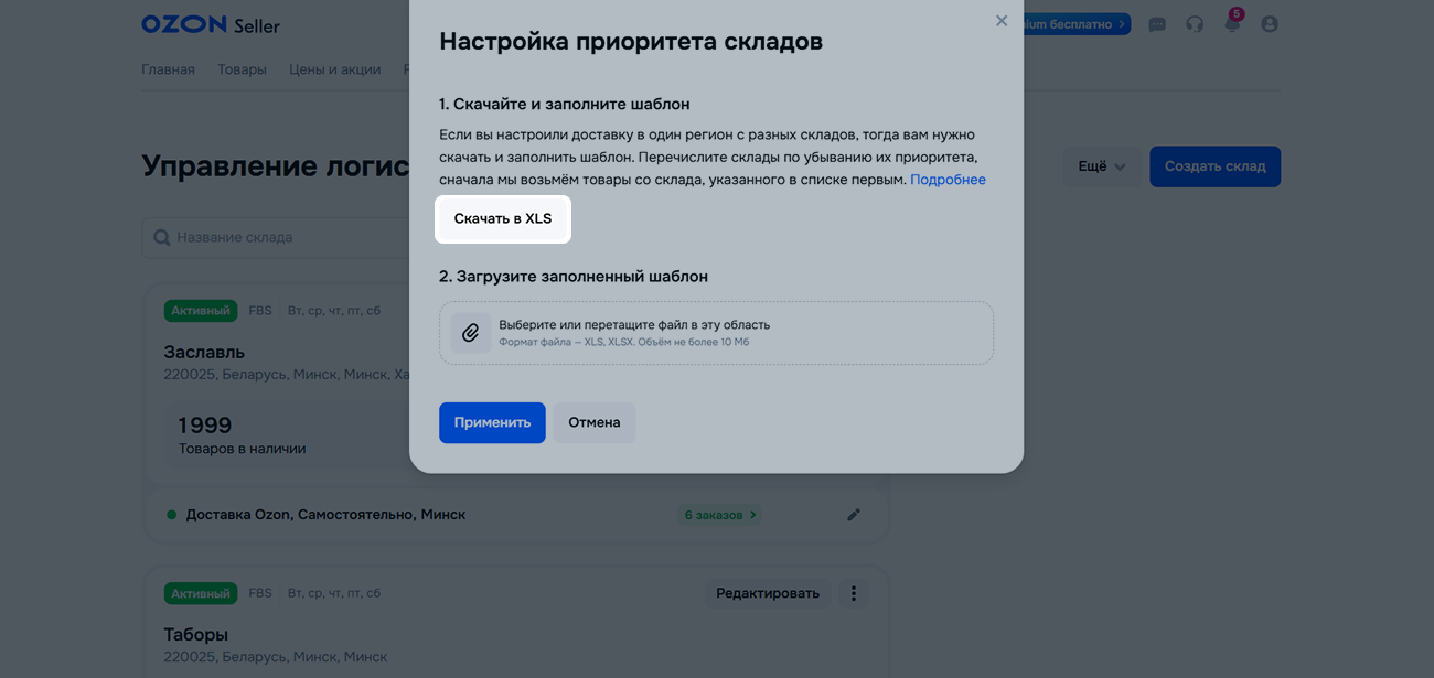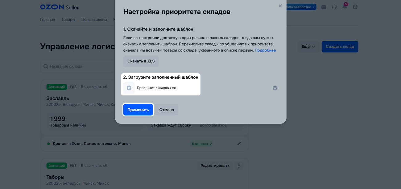 Чтобы изменить настроенный приоритет склада, внесите правки в ранее загруженный шаблон.