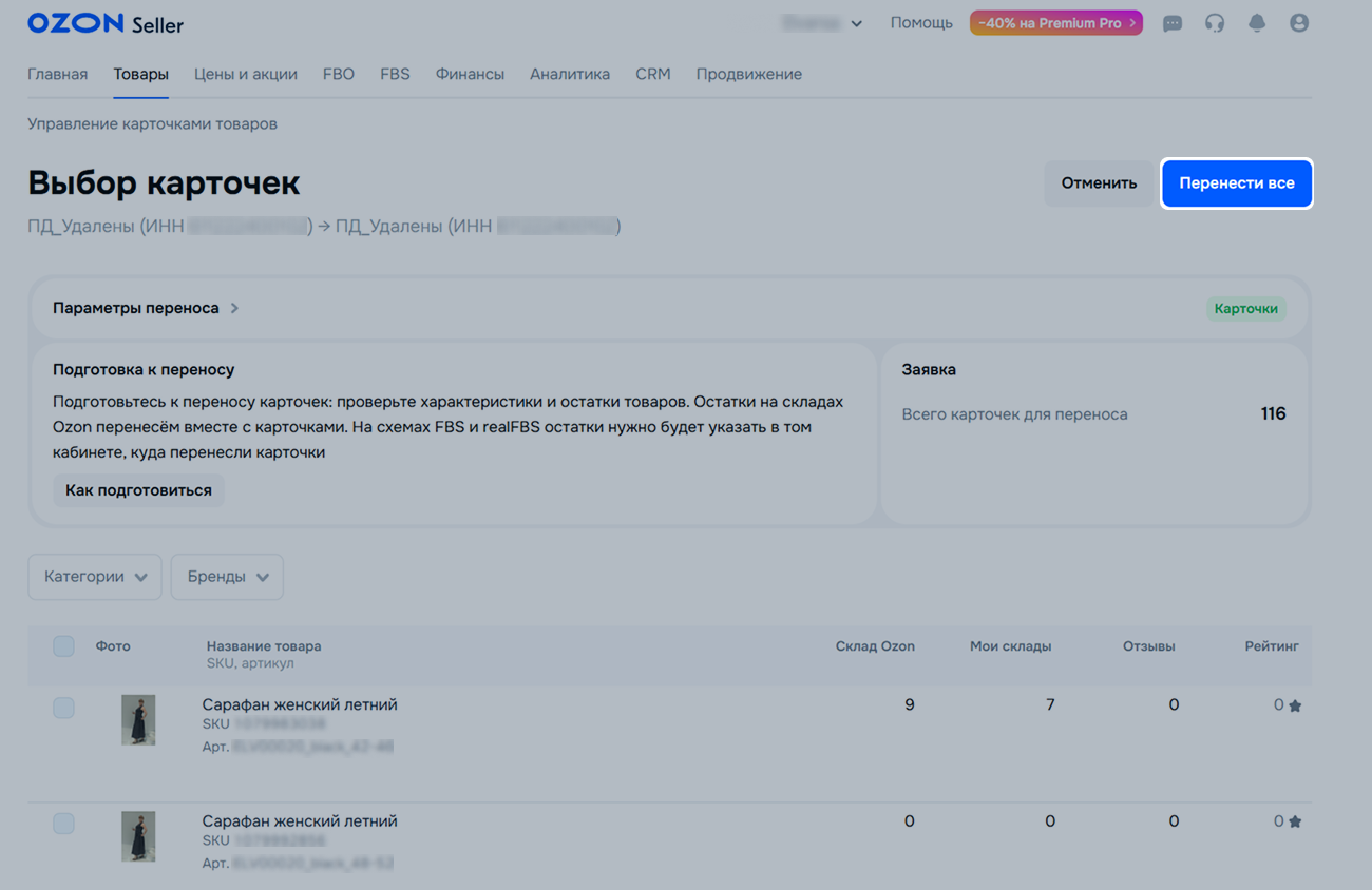 Подтвердите перенос карточек товаров и нажмите Перенести.