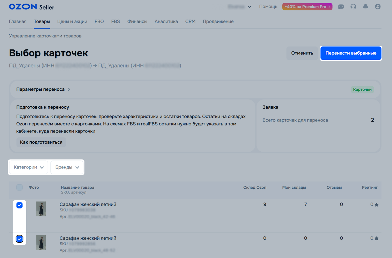Убедитесь, что в личных кабинетах нет дублей: перенести товар не получится, если в другом кабинете есть карточка с такими же параметрами и артикулом — в том числе в архиве. Если есть дубли, отредактируйте карточку в одном из кабинетов.