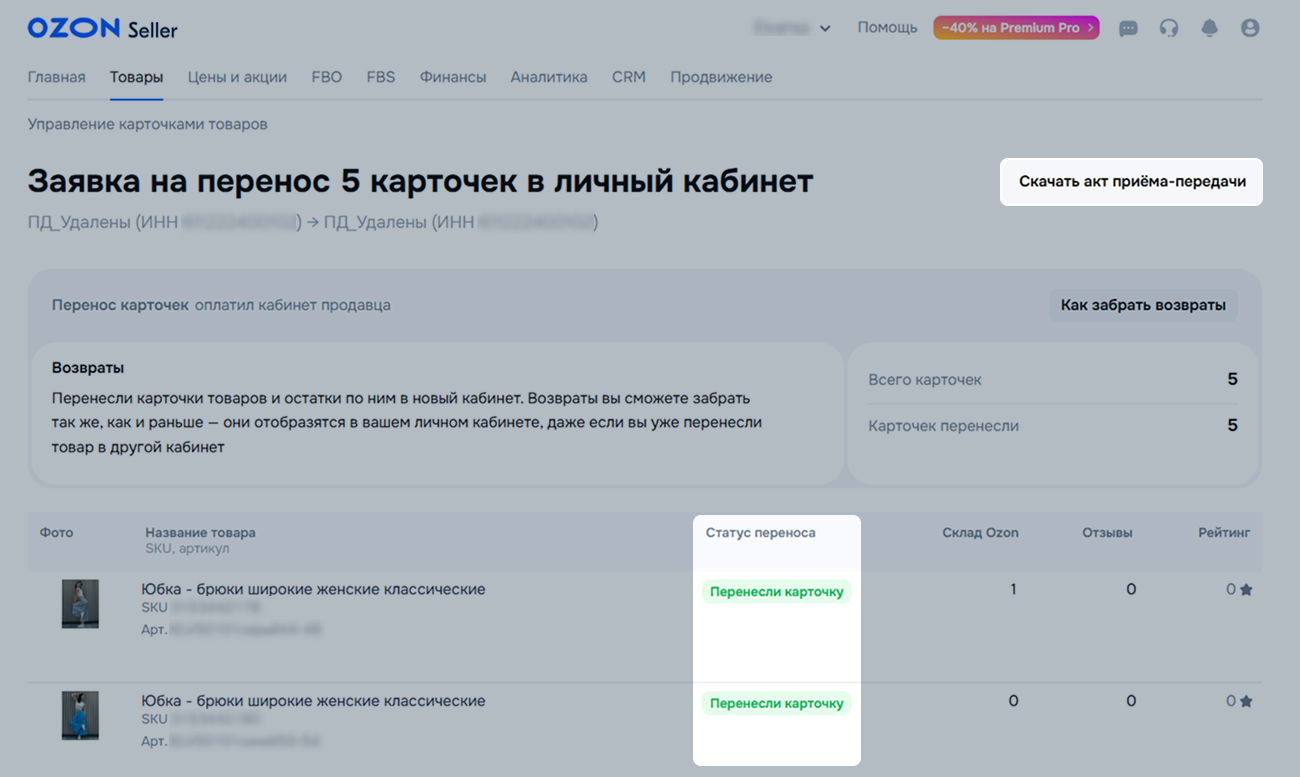 Все товары, которые перенесли из вашего кабинета, отображены в акте приёма-передачи. Чтобы скачать акт, перейдите в заявку на перенос и нажмите Скачать акт приёма-передачи.