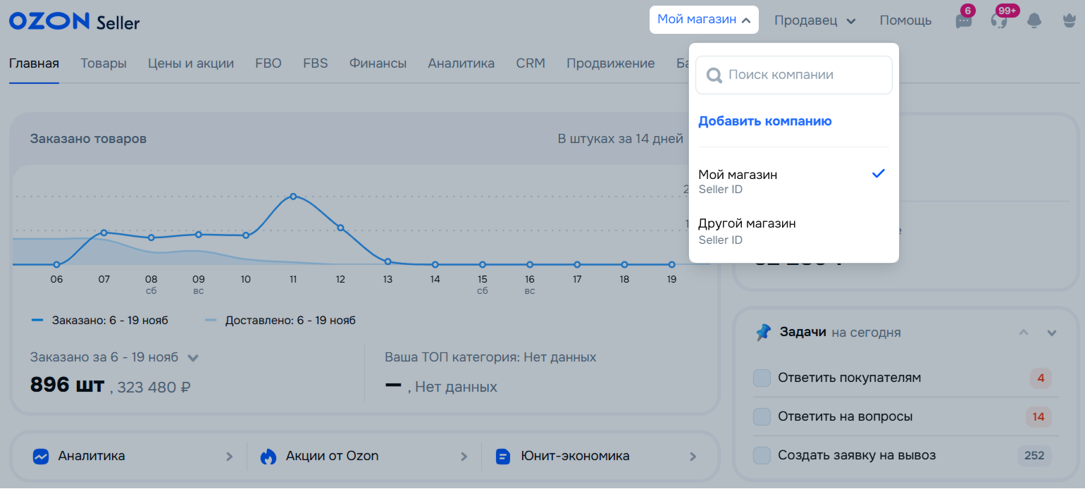Все ваши аккаунты будут привязаны к одному Ozon ID — сможете переключаться между ними без пароля. Для этого нажмите на название магазина в правом верхнем углу и выберите компанию из списка.
