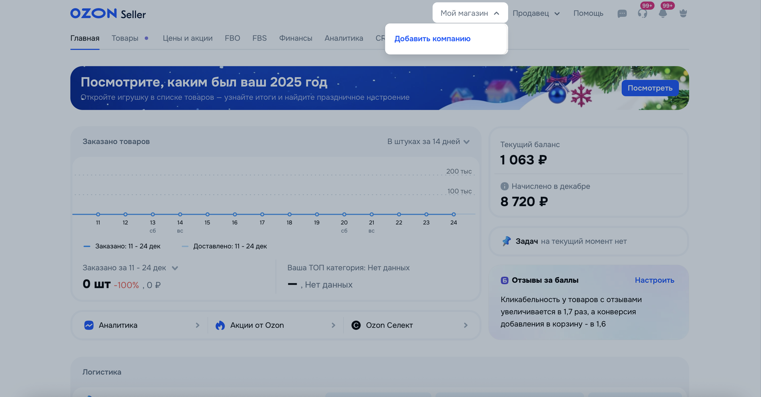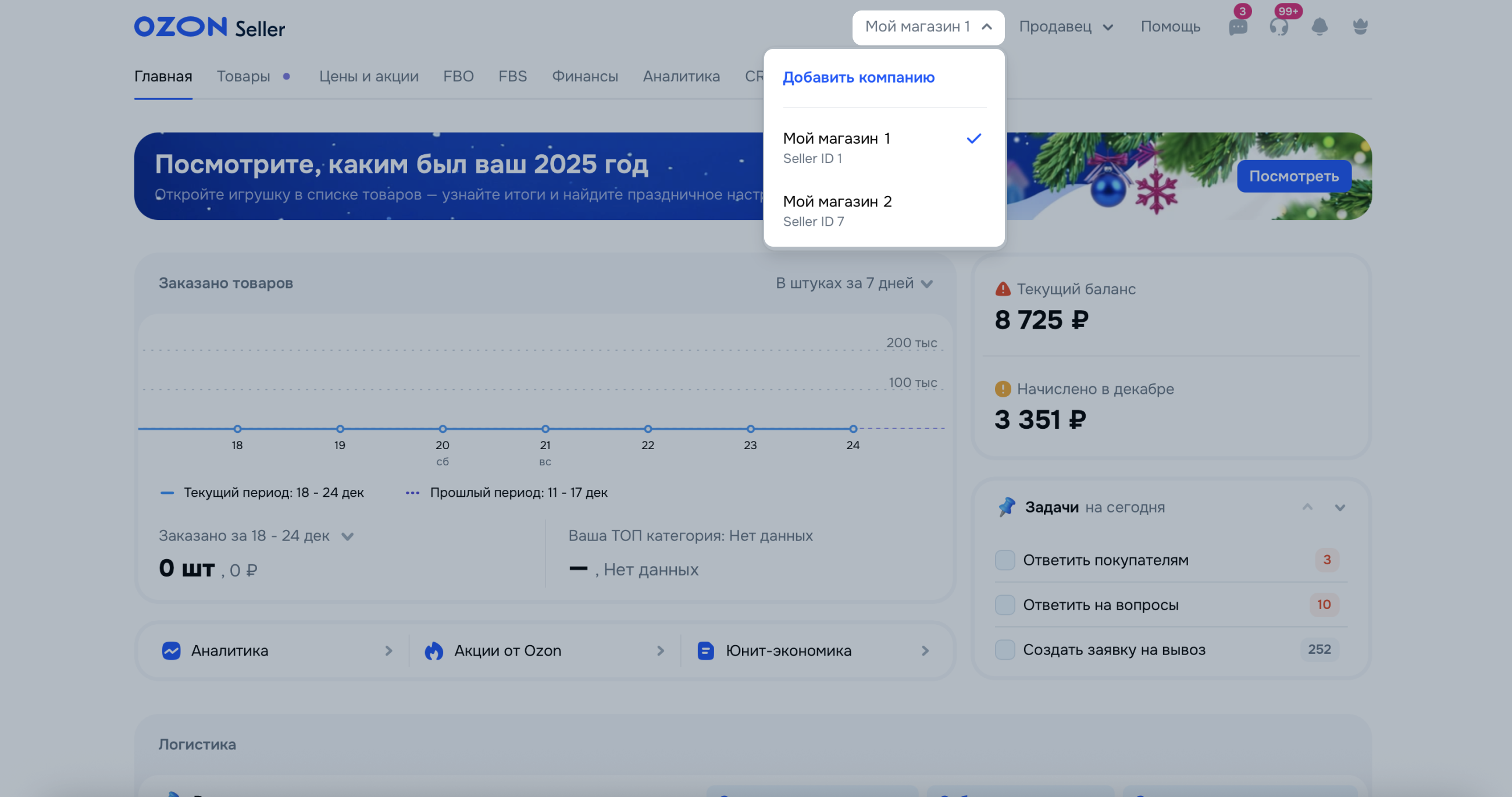 Чтобы переключаться между аккаунтами, нажмите на название магазина и выберите нужную компанию из списка.