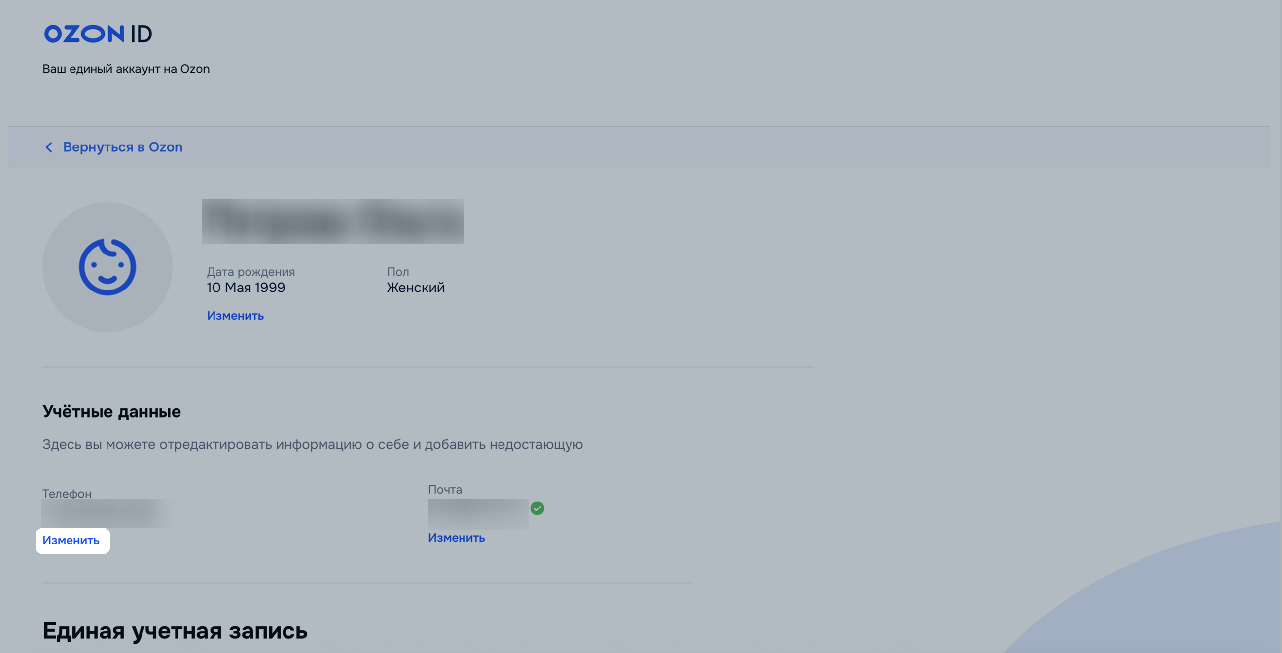 На вкладке Учётная запись нажмите Перейти в профиль Ozon ID.