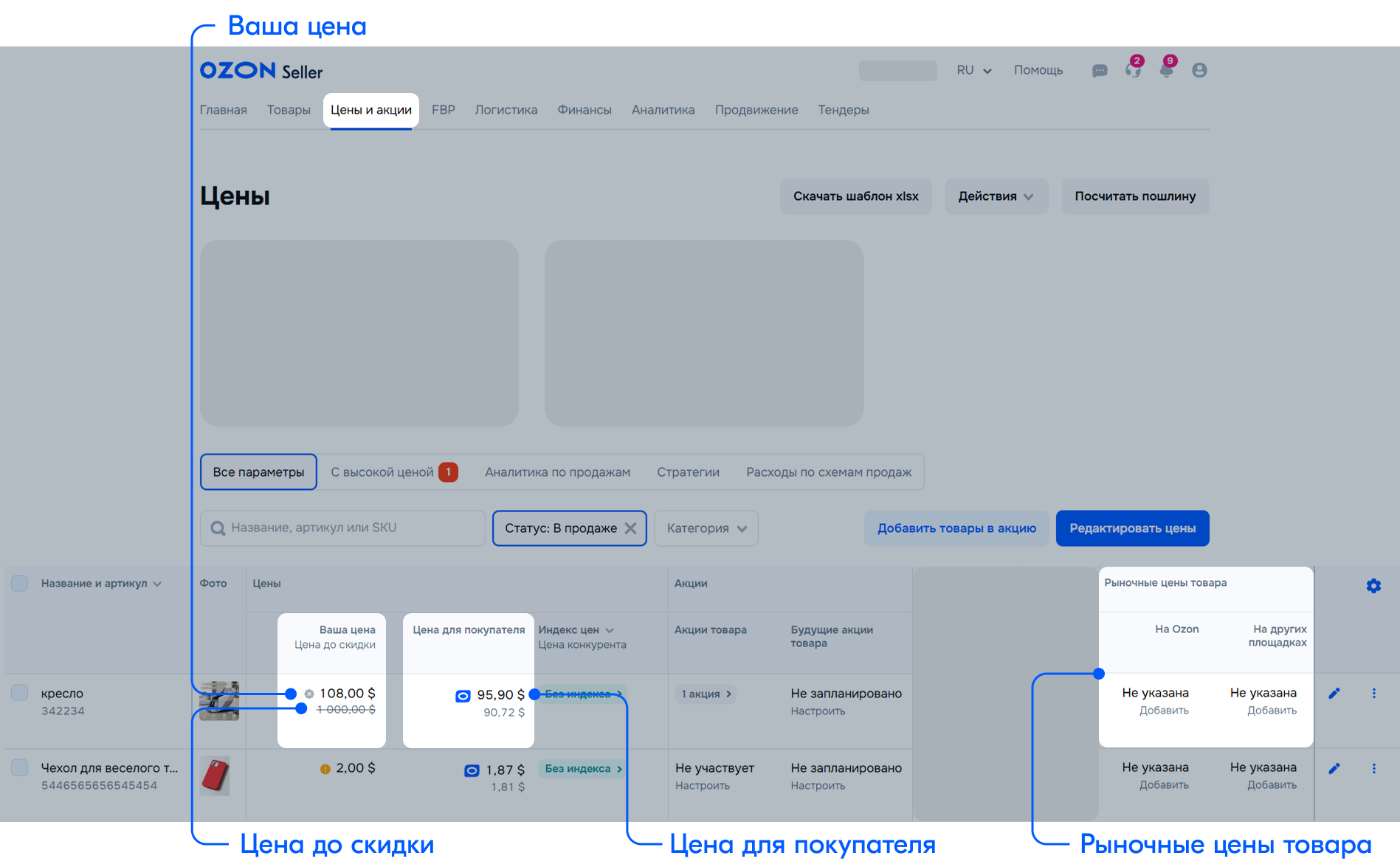 Цена до скидки — зачёркнутая цена, которую видят покупатели. Показывается только на товарах, которые участвуют в акциях от Ozon или в собственных акциях продавца типа «Скидка».
