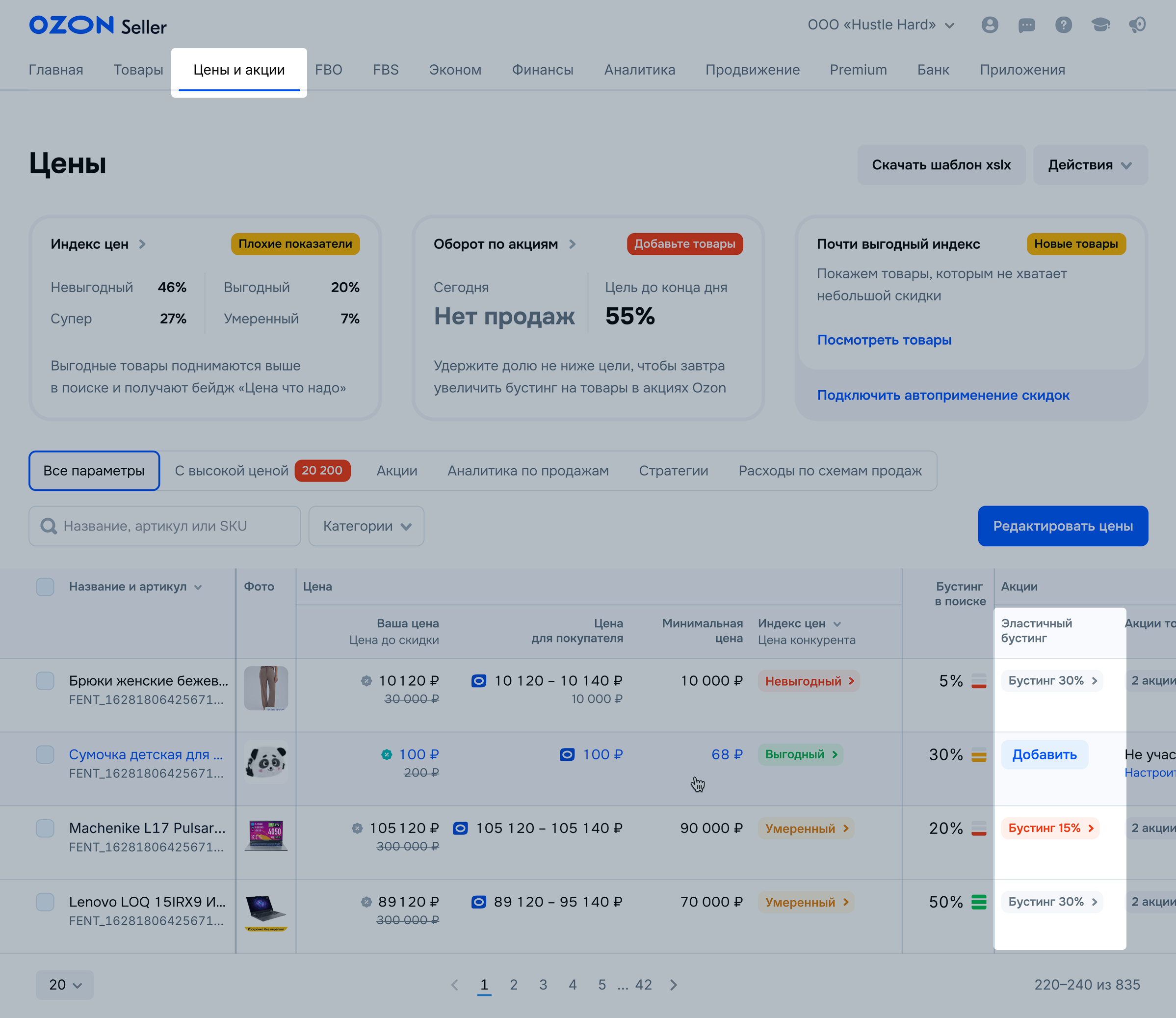 Если вы хотите повысить цену товара в акции «Эластичный бустинг» или удалить товар из акции, сделайте это на странице акции в разделе Цены и акции → Акции от Ozon.