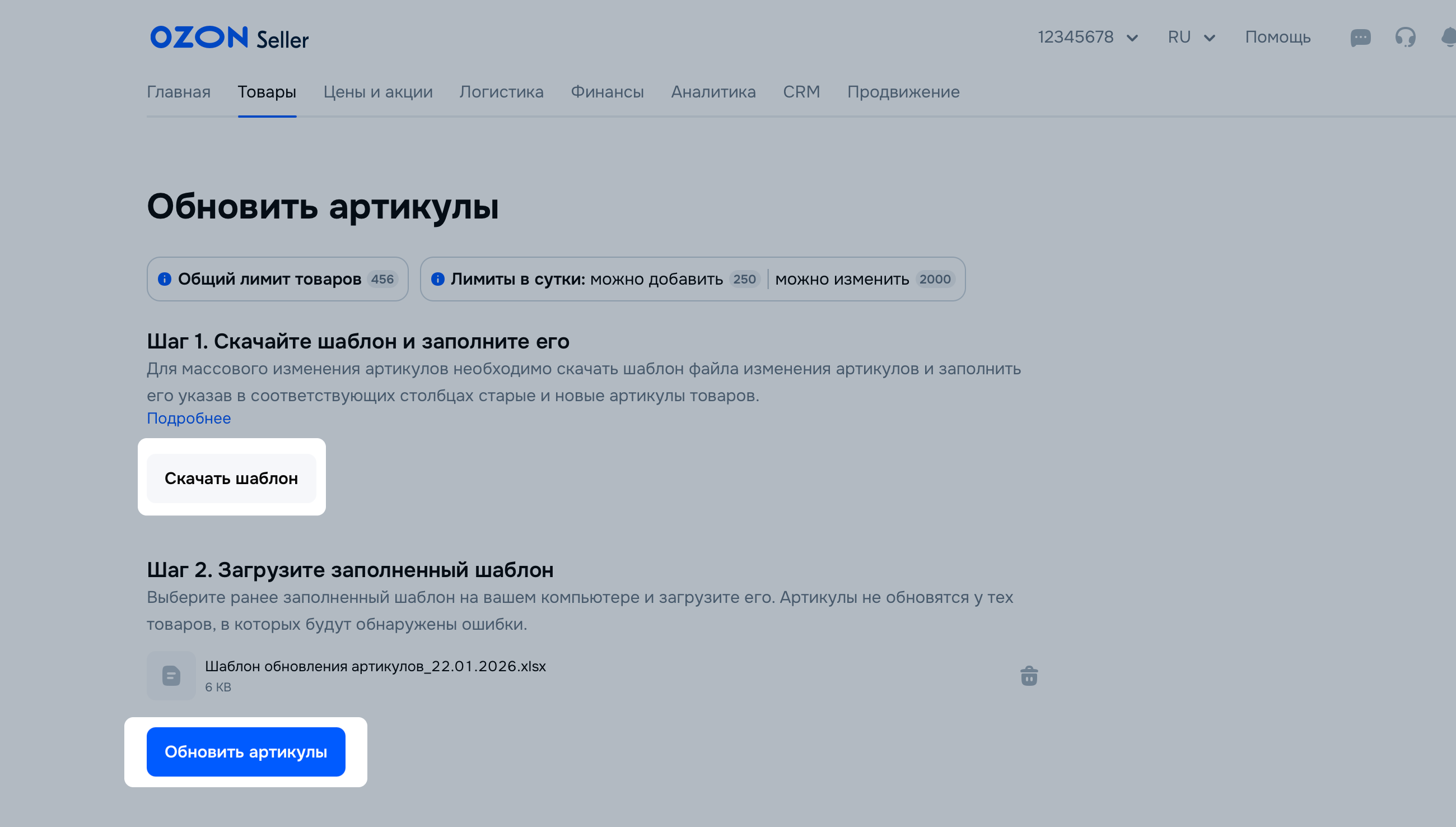 В XLS-шаблоне управляйте артикулами в столбце «Артикул», он обязателен для заполнения. Артикул товара можно редактировать без ограничений.