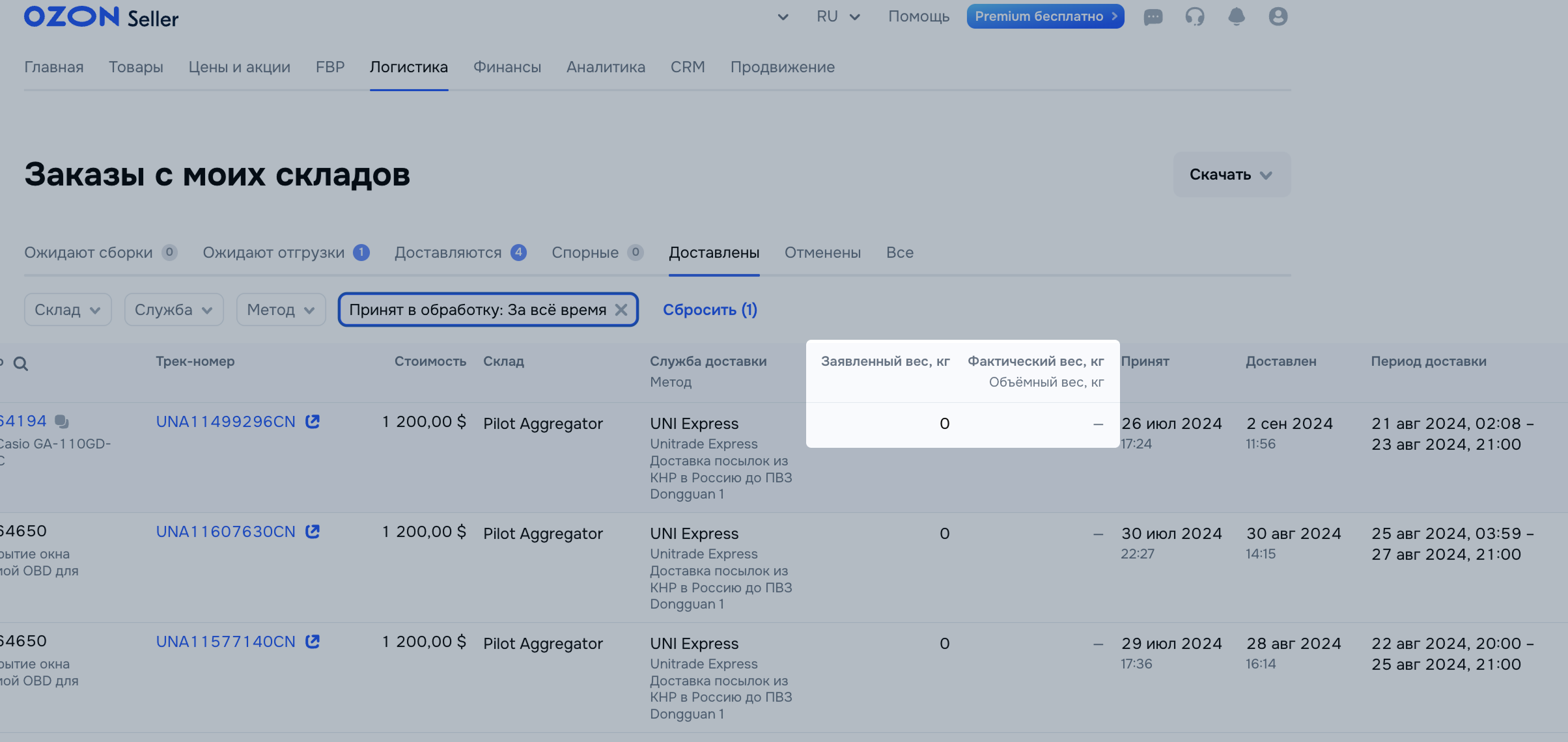 В личном кабинете в разделе Логистика → Заказы с моих складов указаны заявленный и фактический вес товара.