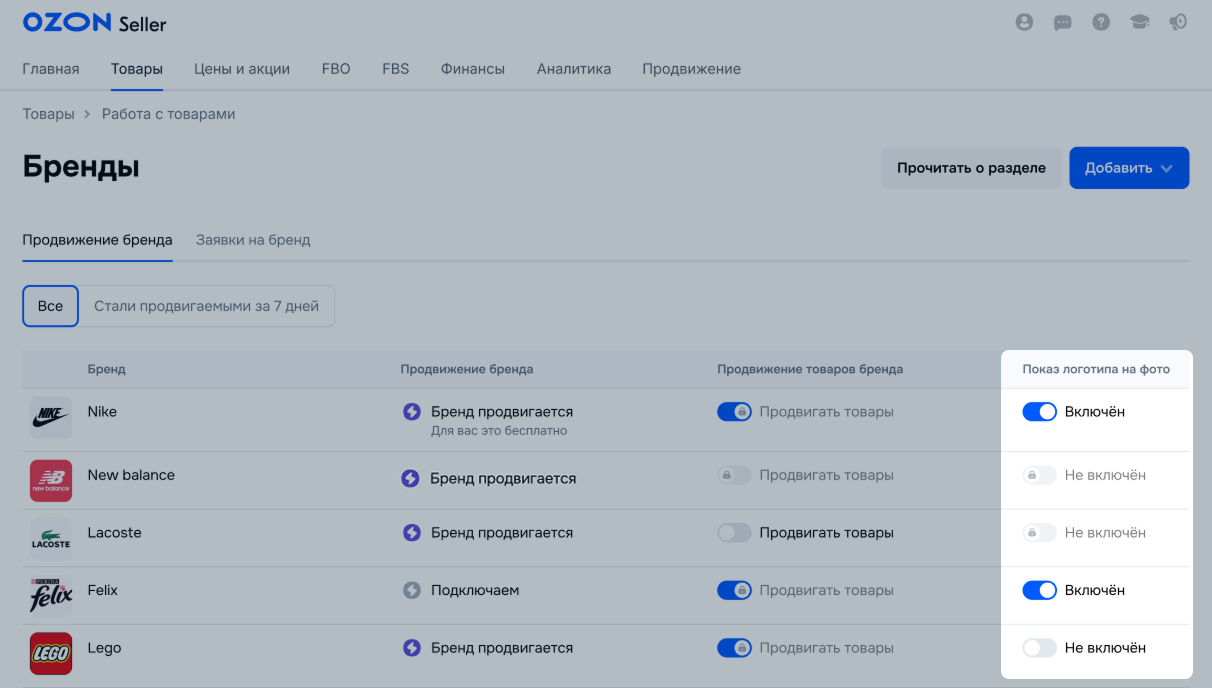 Размещение логотипа можно настроить в личном кабинете Товары → Бренды, в столбце «Показ логотипа на фото».
