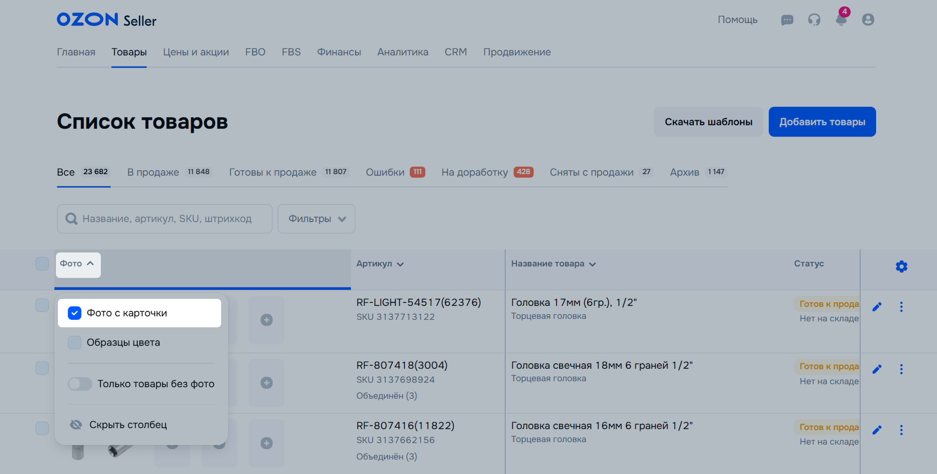 Чтобы товары начали продаваться, добавьте фото. Во всех категориях, кроме «Автотовары», «Спорт и отдых» и «Строительство и ремонт» можно сначала создать карточку товара, а потом загрузить фото.