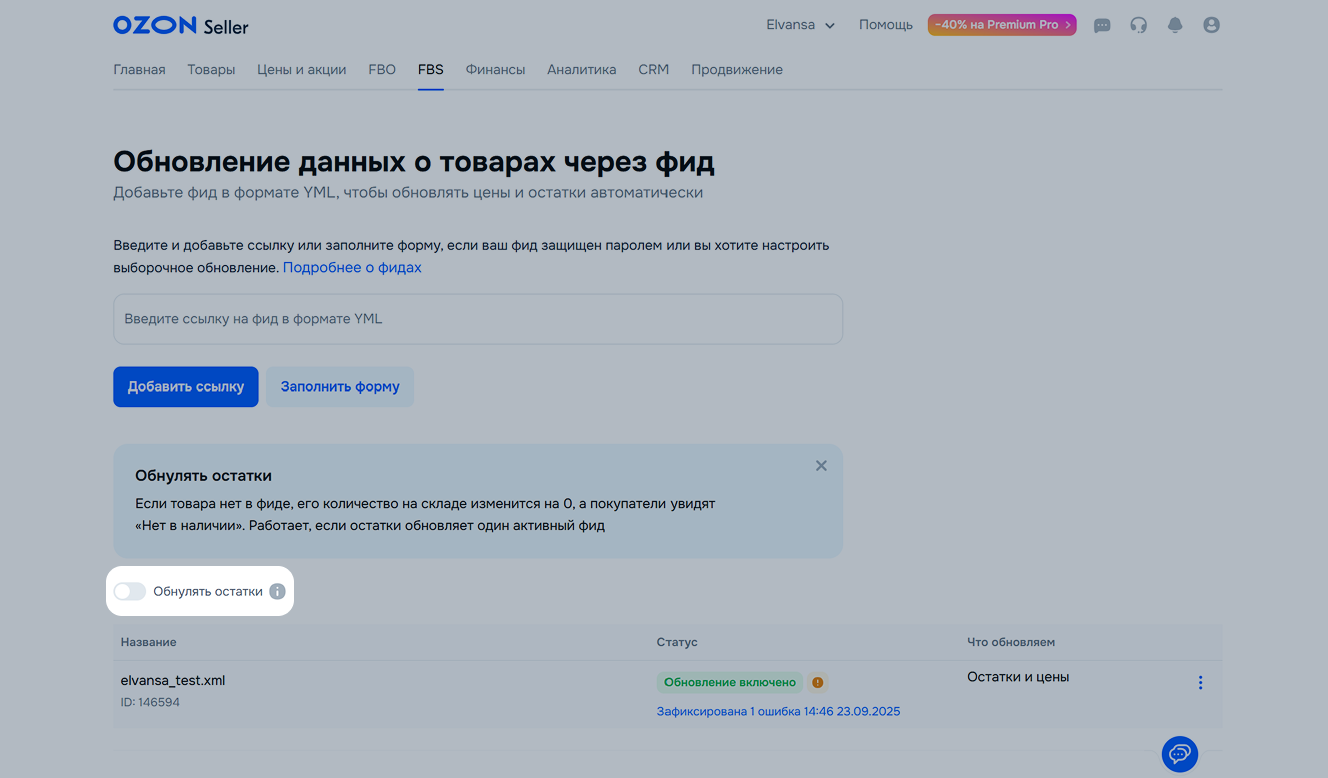 Чтобы автоматически обнулять остатки для товаров, которых нет в фиде, включите Обнулять остатки. Опция доступна, если для обновления остатков у вас работает один фид. Для работы с ценами можно использовать несколько фидов.