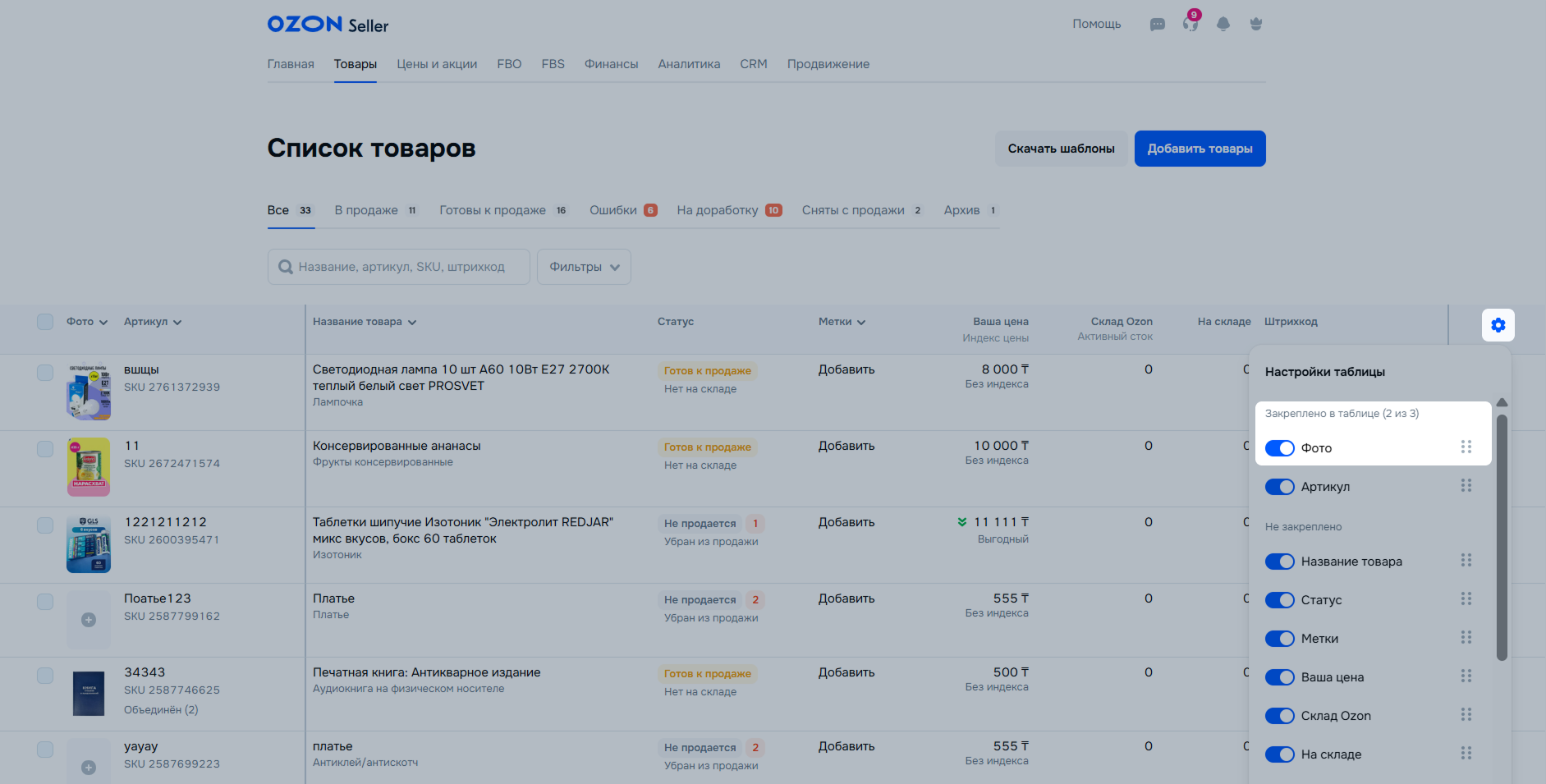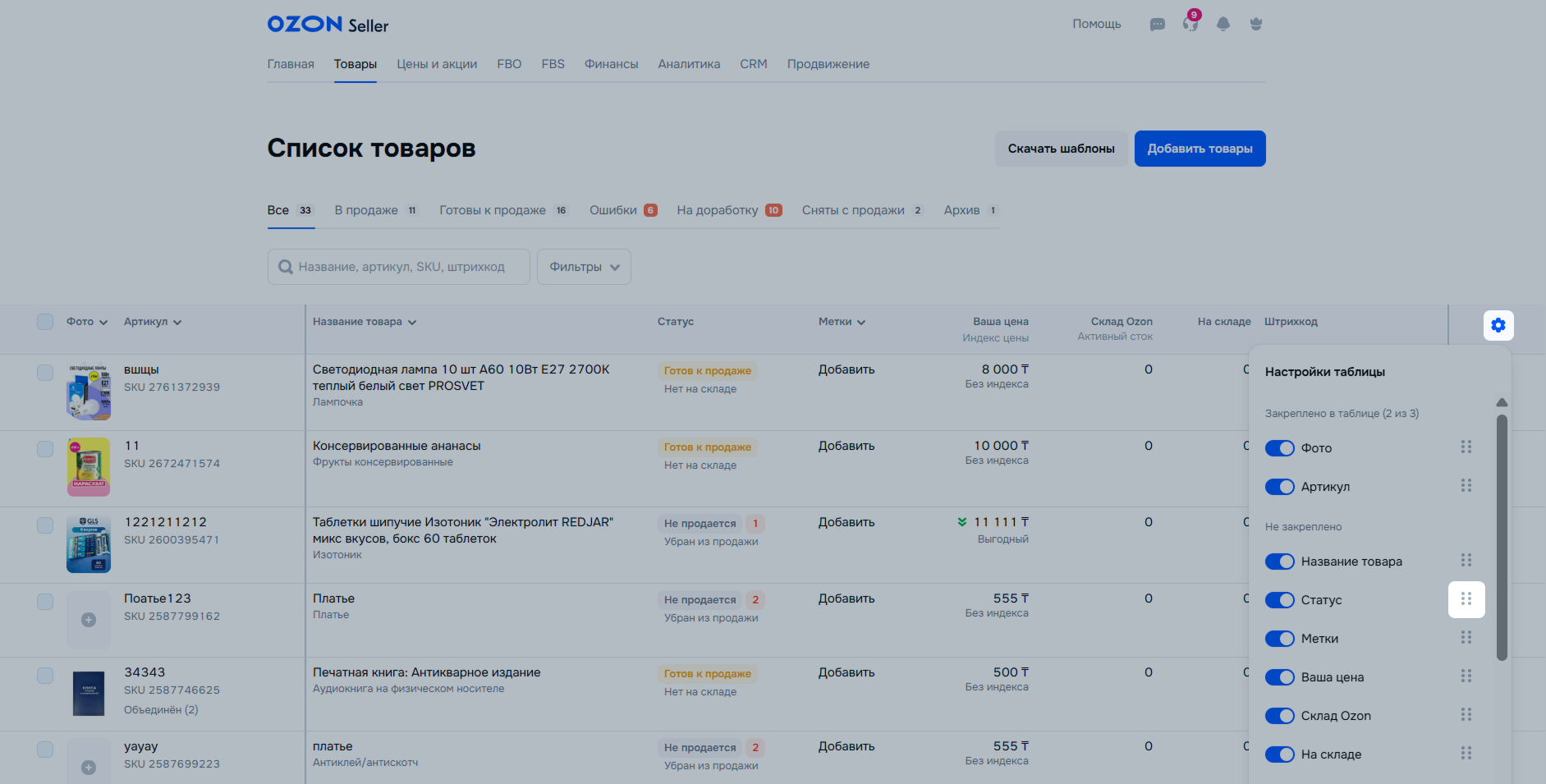 Вы можете следить за статусами товаров и архивировать их в личном кабинете в разделе Товары → Список товаров. В нём распределяем товары по вкладкам в зависимости от их статуса на этапе модерации: