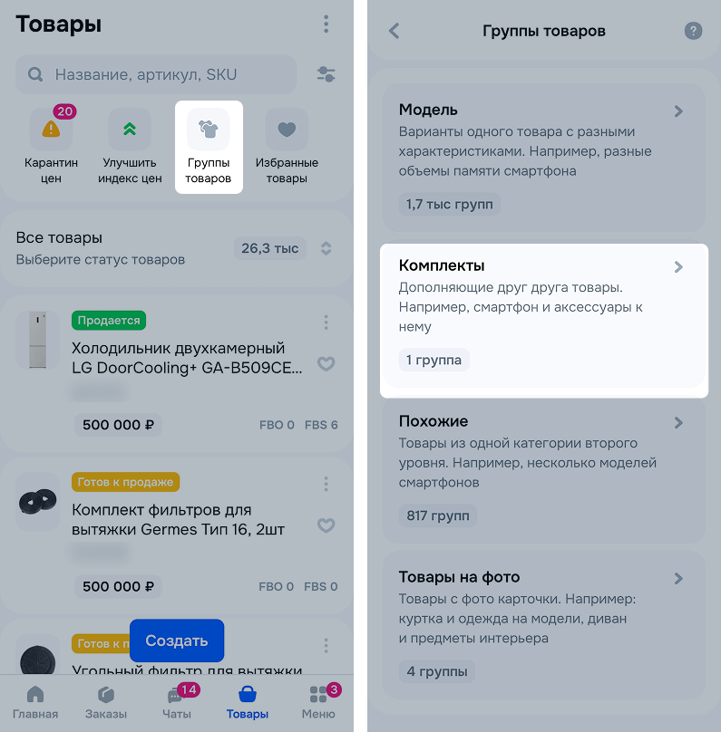 Выберите вкладку Комплекты.