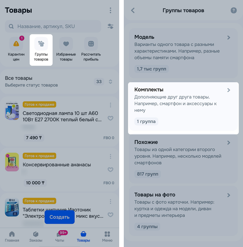 Проверьте, какие товары объединили в комплект и как они отображаются в карточке.