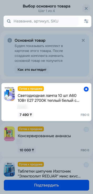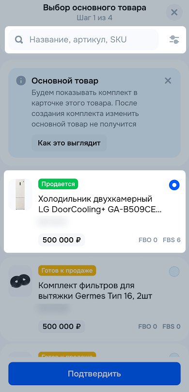 Подтвердите выбор. После того, как сохраните комплект, изменить основной товар не получится.
