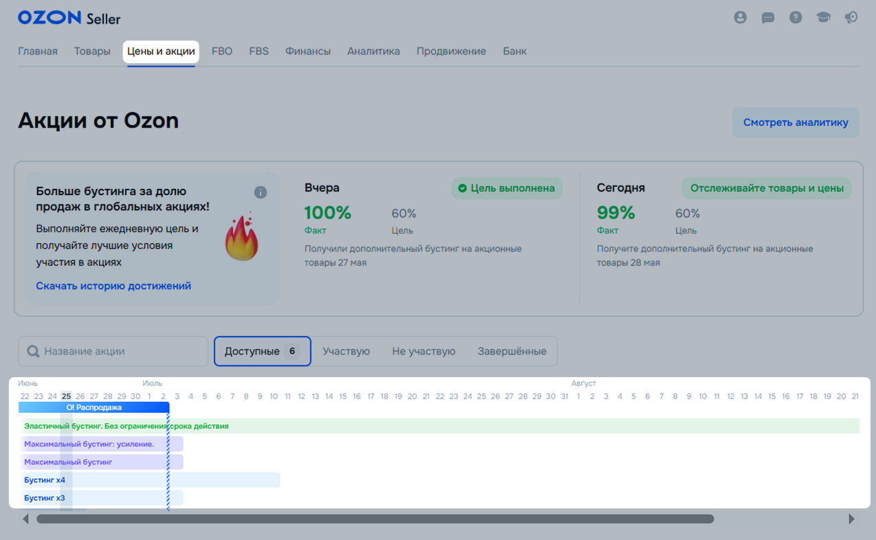 Чтобы принять участие в распродаже, добавьте товары в одну из акций или сразу во все: «Эластичный бустинг. Без ограничения срока действия», «Максимальный бустинг», «Максимальный бустинг: усиление» или в другие акции из календаря распродаж в разделе Цены и акции → Акции от Ozon.