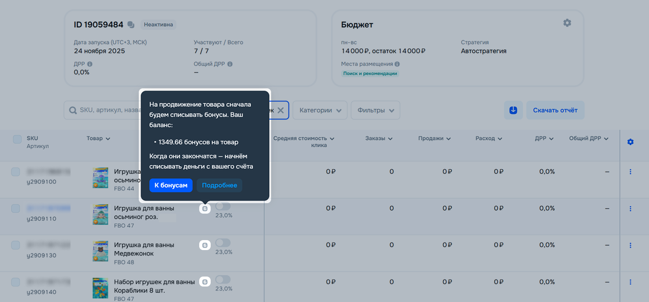 Чтобы расходовать бонусы, самостоятельно запустите кампанию по продвижению.