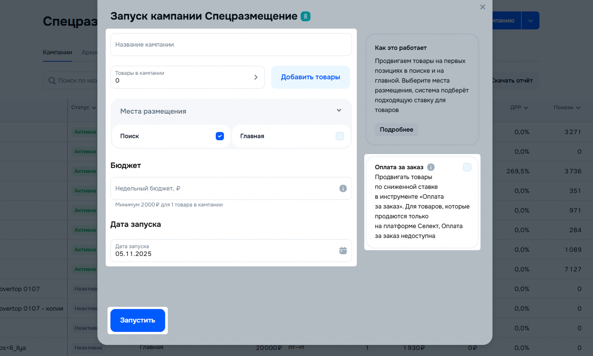 Товары, которые вы добавили в кампанию, будут одновременно продвигаться в оплате за заказ — так вы получите дополнительные преимущества в продвижении. Чтобы это изменить, в блоке Оплата за заказ отключите продвижение. Вы сможете изменить эту настройку в любой момент.