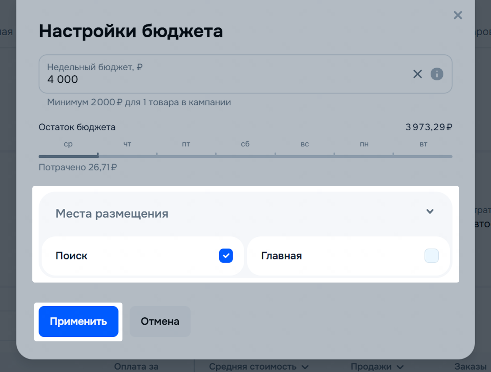 Установите недельный бюджет из расчёта 2000 рублей на товар — сумма будет равномерно распределяться в течение 7 дней.