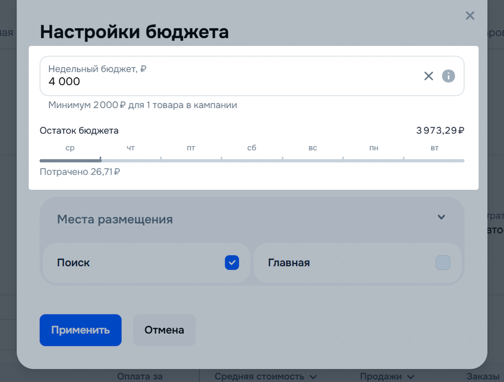 Это сумма, которую вы готовы потратить на продвижение за 7 дней. Начало периода — день недели, в который создана кампания. Задать произвольный интервал не получится, даже если остановить и перезапустить продвижение в середине или в конце периода. Например, если создаёте кампанию в среду, бюджет будет расходоваться до следующего вторника включительно.