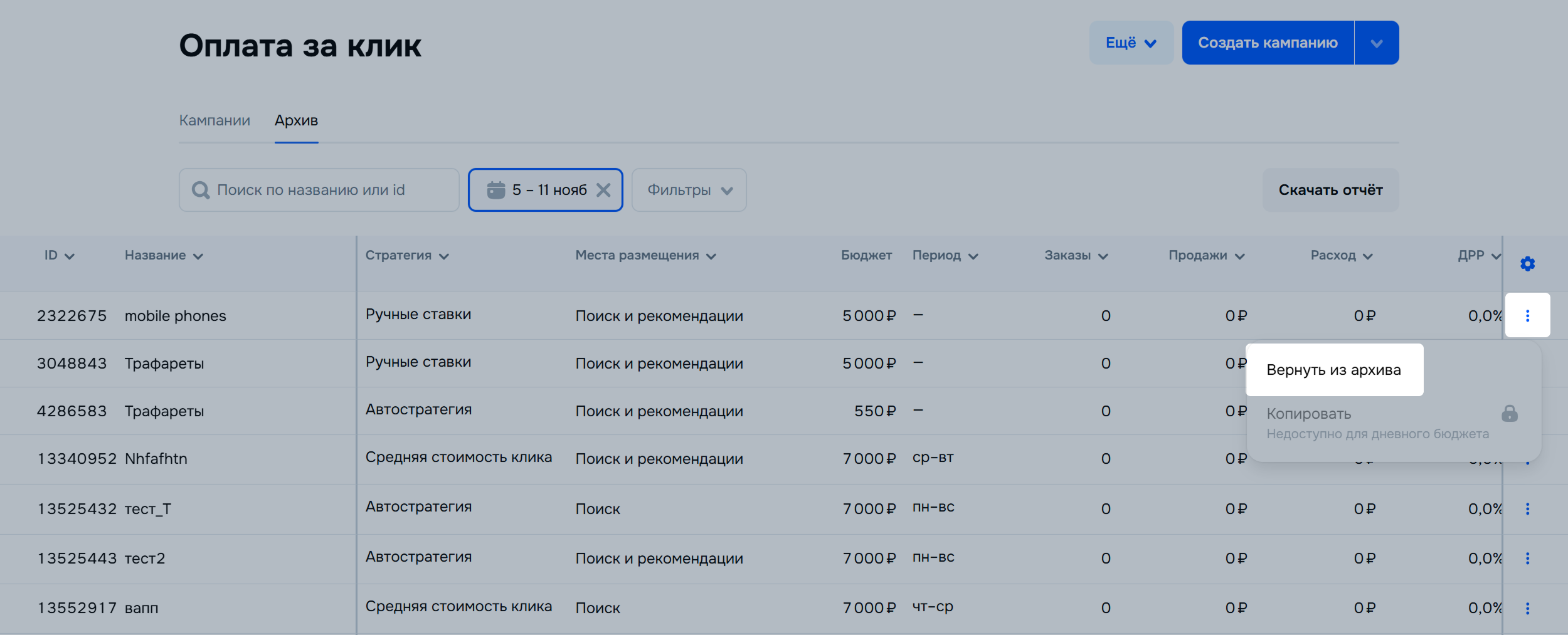 Чтобы вернуть кампанию из архива, нажмите ⋮ → Вернуть из архива.