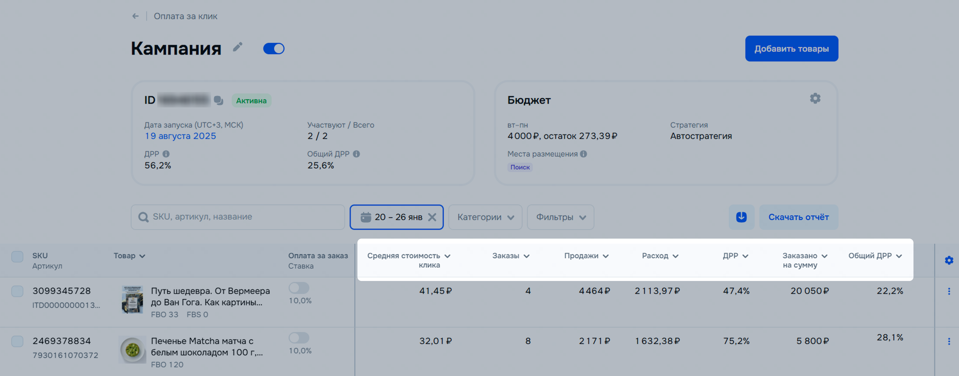 Данные метрик «Заказано на сумму» и «Общий ДРР» отображаются для кампаний, созданных с 16 января 2026 года.