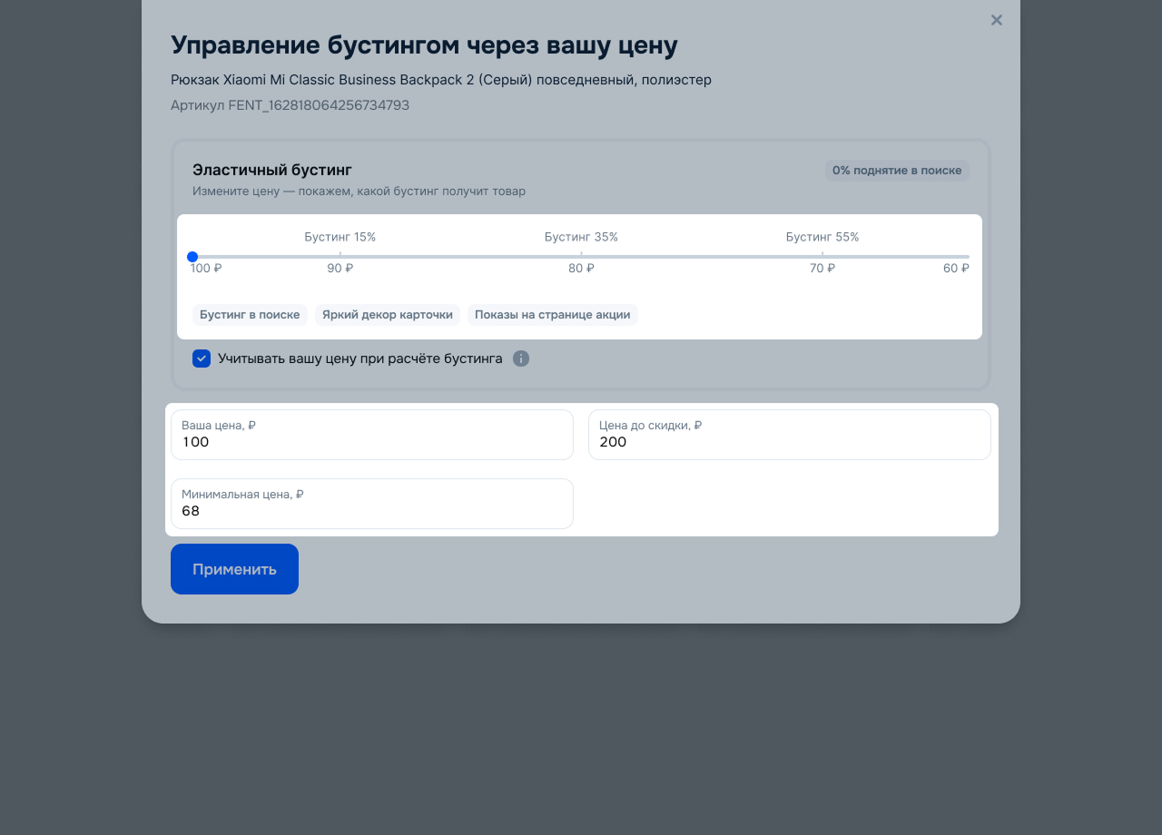 Вы можете управлять эластичным бустингом, меняя вашу цену, в разделе Цены и акции → Цены на товары.