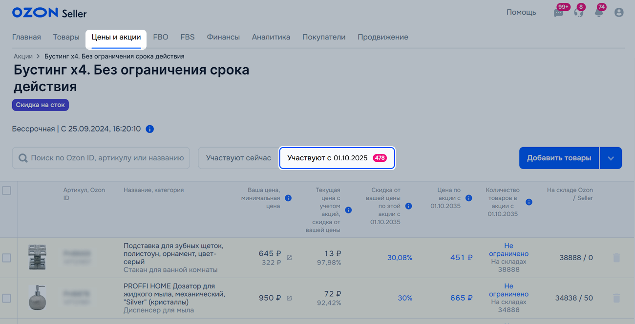 На вкладке Участвуют с (дата) вы можете управлять товарами в акции: изменять цену, скидку, сток, добавлять и удалять товар в акции. В указанную дату, в 00:00 по московскому времени, система начинает обрабатывать и применять цены автодобавления. Редактирование будет недоступно в течение нескольких часов. После обработки вкладка Участвуют с (дата) исчезнет и вы сможете вносить изменения на странице акции со списком товаров. При этом редактирование товаров на вкладке Участвуют сейчас доступно в любой момент.