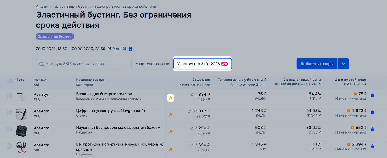 Если скидка на товар перестала соответствовать условиям акции, на вкладке Участвуют сейчас такой товар отметим