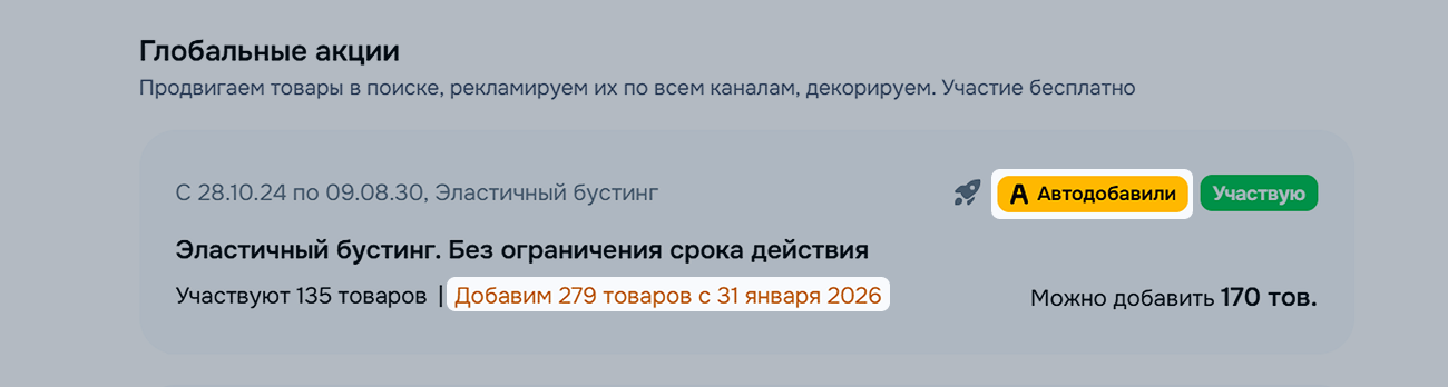 Отметим бейджем «Автодобавили» акции, в которые автоматически добавили товары. Под названием акции укажем, с какой даты и на какое количество товаров применим скидку.