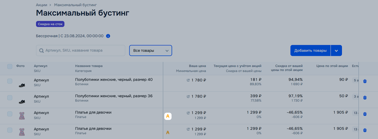 Вы можете продвигать товары, создавая собственные акции. Для них вы сами определяете сроки, ассортимент и размер скидок.