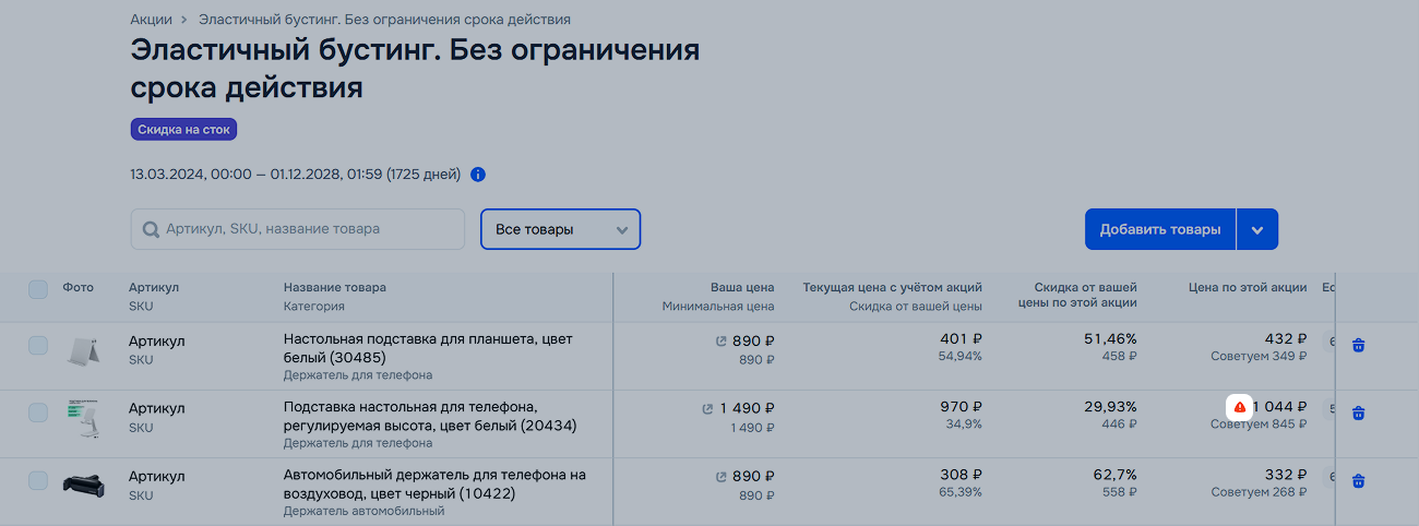 10 декабря автоматически добавили товар в активную акцию без ограничения срока действия с применением цен 17 декабря, в 00:00 по московскому времени. Вы можете отредактировать автоматически добавленные товары: