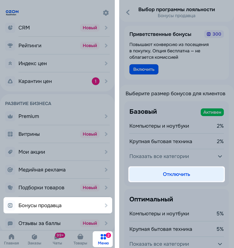 Чтобы подключить приветственные бонусы в мобильном приложении, в разделе Меню → Бонусы продавца перейдите в активный набор и нажмите Включить.