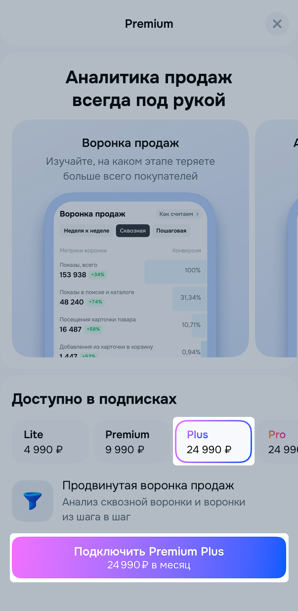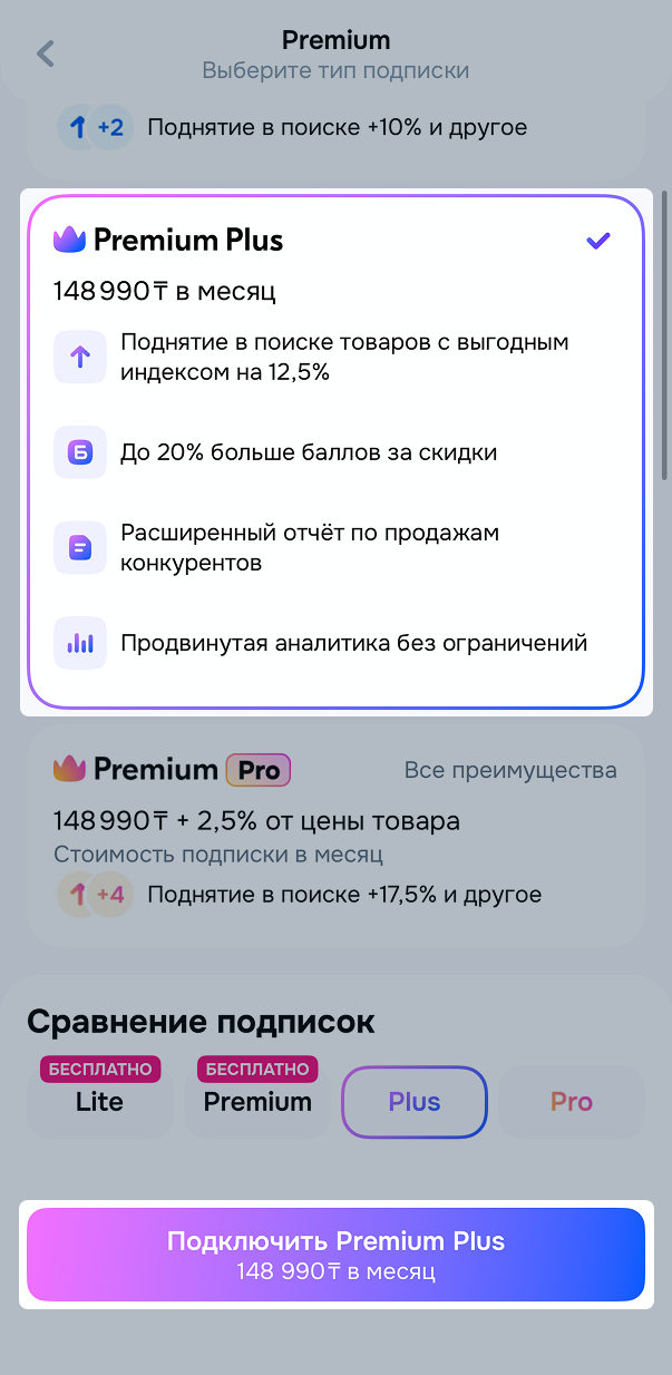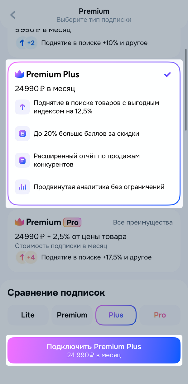 Premium Plus — подписка для продавцов, которую можно оформить как дополнительную услугу в личном кабинете продавца.