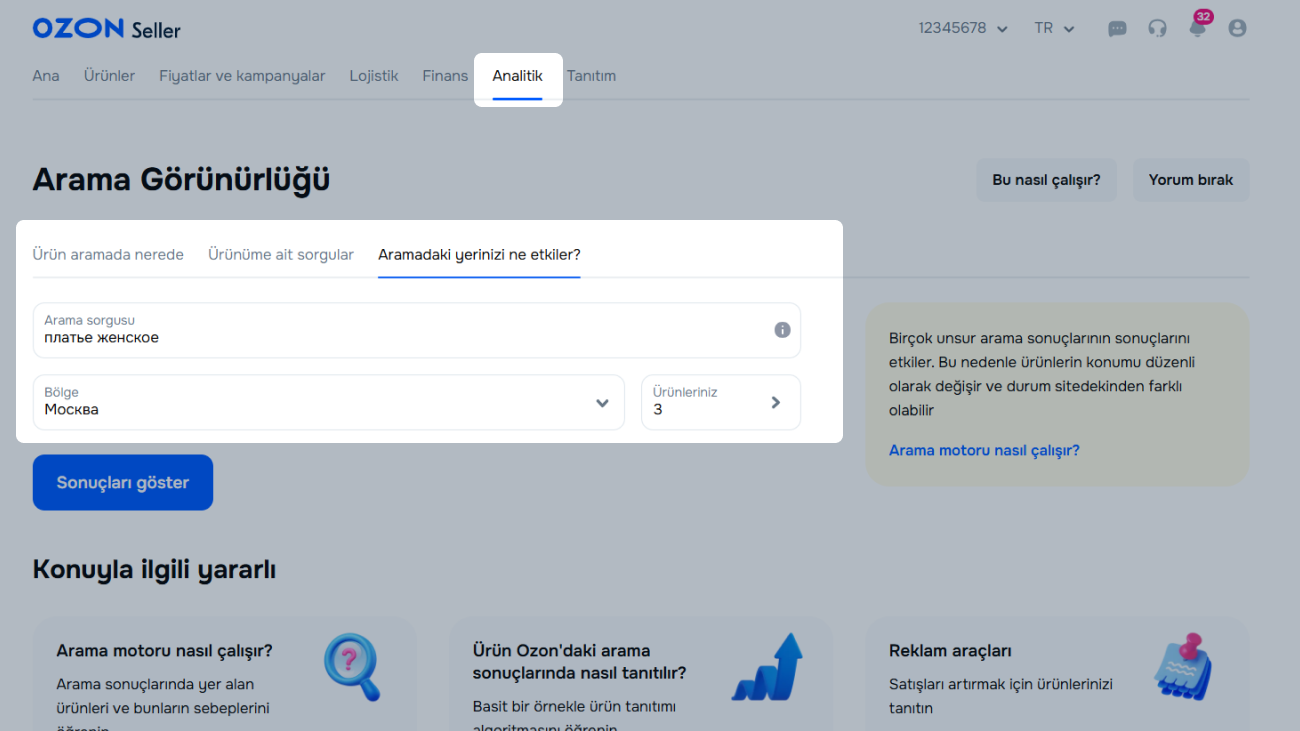 “Aramadaki yerinizi ne etkiler” aracını kullanarak aramadaki ürünleri analiz edebilir ve teklifin neden belirli bir konumda olduğunu anlayabilirsiniz.