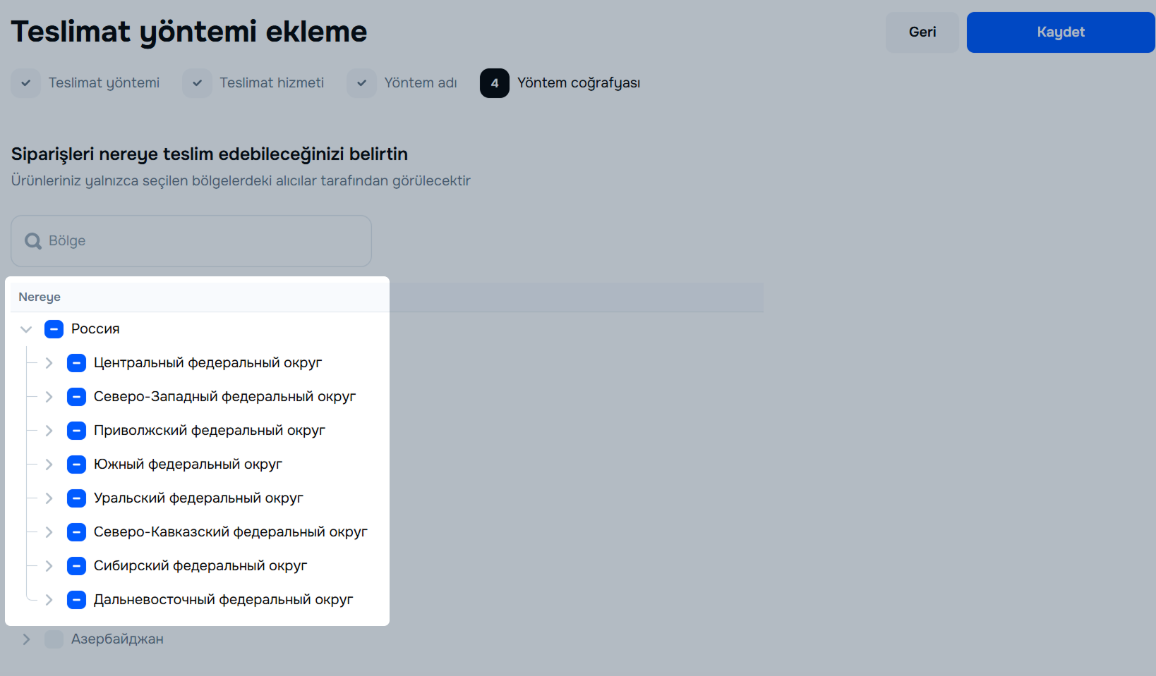 Teslimat coğrafyasını ayarlayın. Mevcut bölgeleri görüntüleyebilir ve ürün teslim etmeye hazır olduğunuz bölgeleri seçebilirsiniz.