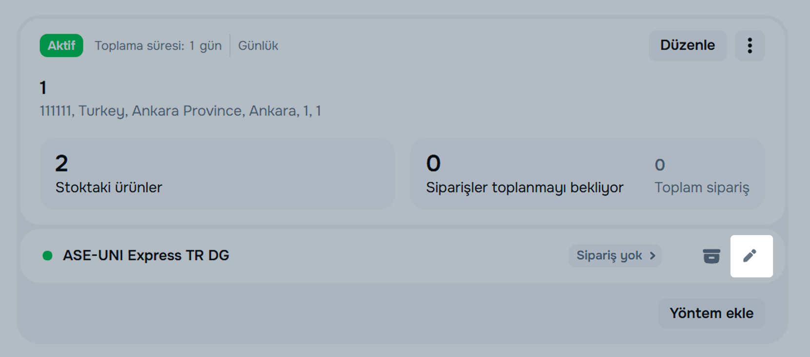 Sevkiyat noktası, ürünleri gönderdiğiniz nokta ile aynı olmalıdır. Adresler farklıysa alıcıların siparişlerinin gerçek teslimat sürelerini görebilmeleri için nokta adresini güncelleyeceğiz.