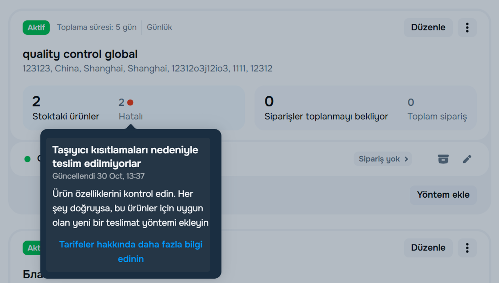 Sorunlu ürünlerin bulunduğu depoların listesini gözden geçirin ve sipariş aşamasında ürünlerin siparişlerinin başarılı bir şekilde oluşturulabilmesi için depo ayarlarında veya teslimat yöntemlerinde gerekli değişiklikleri yapın.