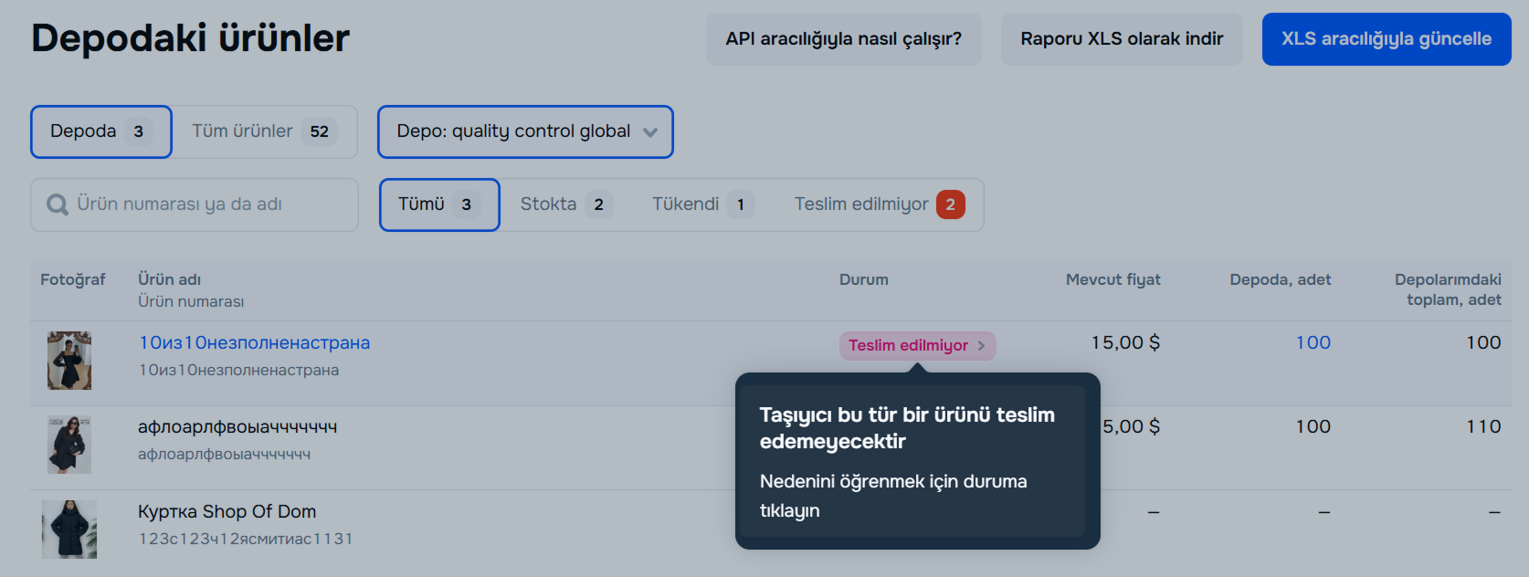 Listedeki sorunlu ürünler Teslim edilmiyor durumuyla vurgulanmış olacaktır.