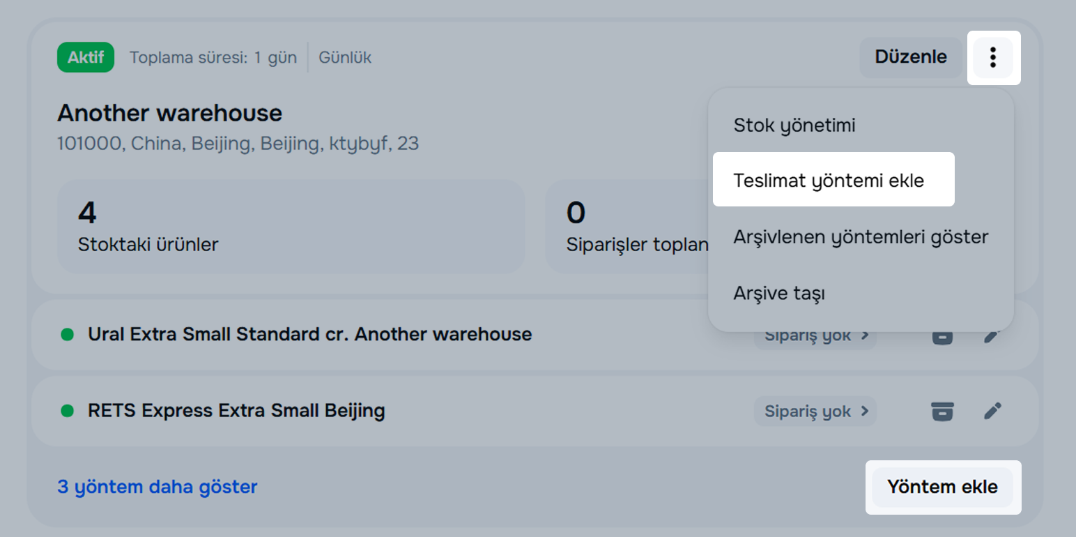 İkinci ve sonraki yöntemleri ekliyorsanız ilgili deponun kartında, Bu depodan teslimat yöntemleri blokundan Yöntem ekle‘ye veya ⋮ → Teslimat yöntemi ekle seçeneğine tıklayın. Bir depoya en fazla 100 yöntem ekleyebilirsiniz.