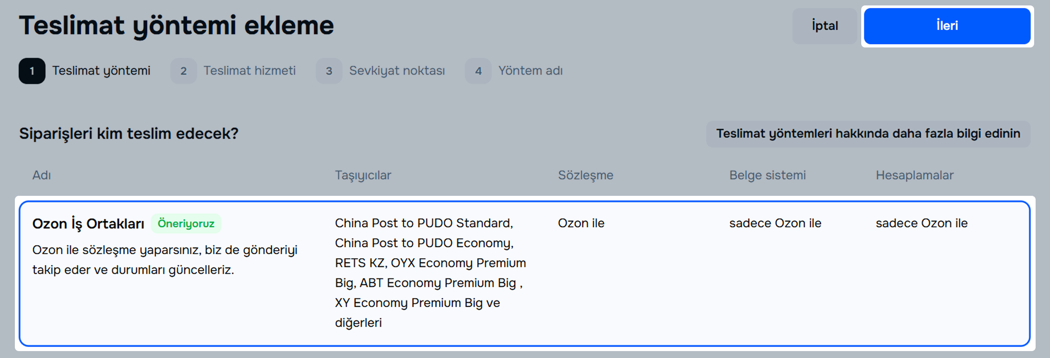 Ozon iş ortakları’nı seçin ve İleri‘ye tıklayın. Teslimat yöntemleri, deponuzun adresine bağlı olarak otomatik olarak seçilecektir.