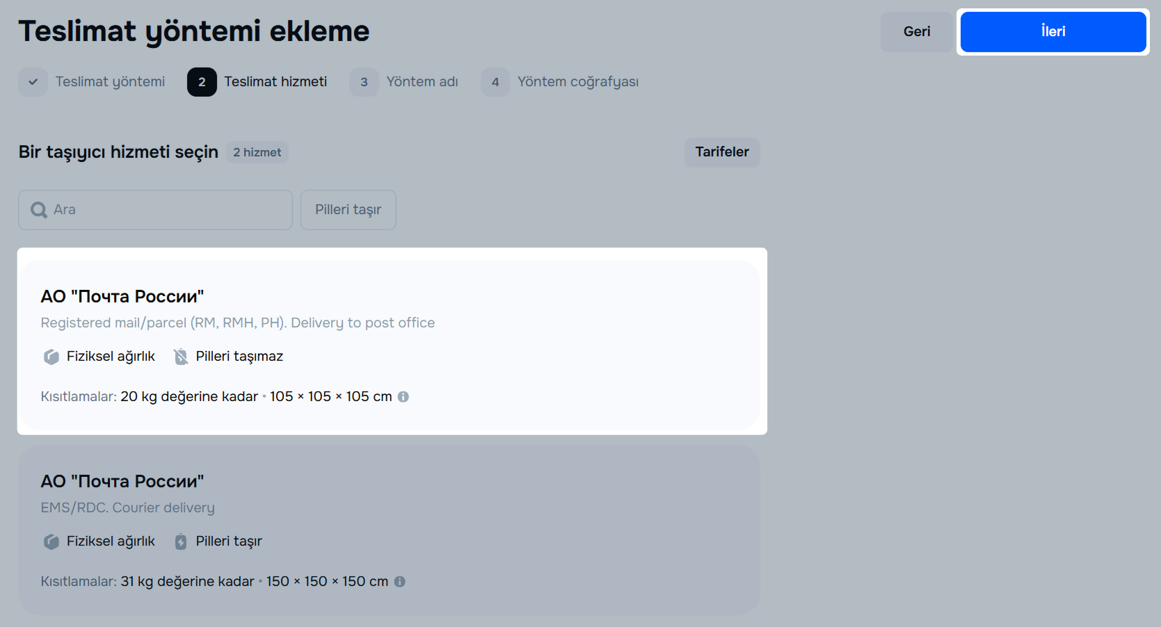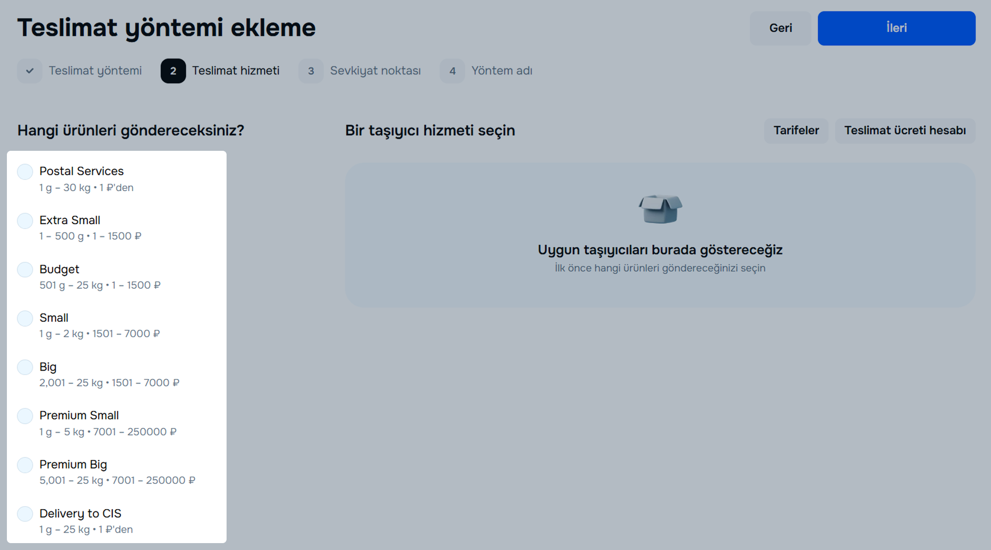 Taşıyıcıyı seçin ve teslimat detaylarını belirttikten sonra İleri’ye tıklayın.