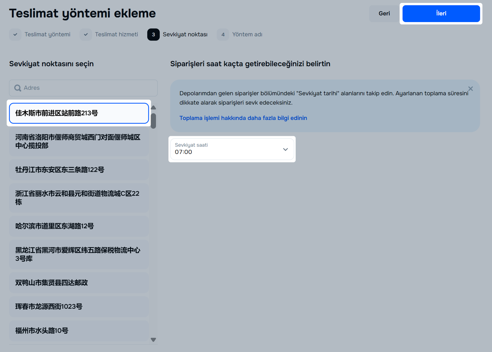 Sevkiyat noktasını seçin ve siparişleri saat kaçta getirebileceğinizi belirttikten sonra İleri’ye tıklayın.