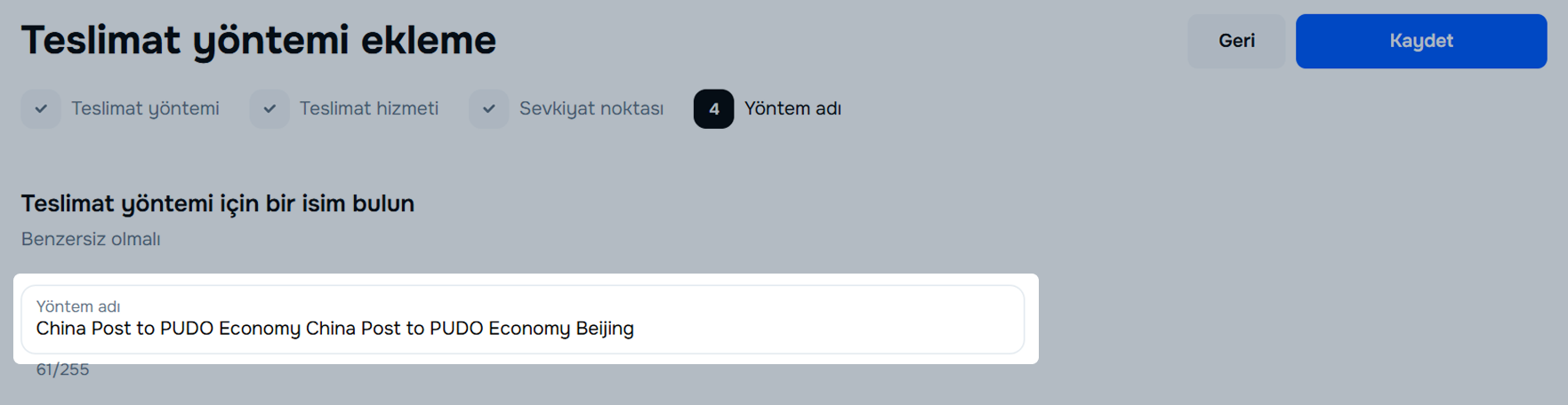 Otomatik olarak oluşturulan yöntem adını ya olduğu gibi bırakın ya da kendiniz bir tane oluşturun. İzin verilen maksimum uzunluk 255 karakterdir.