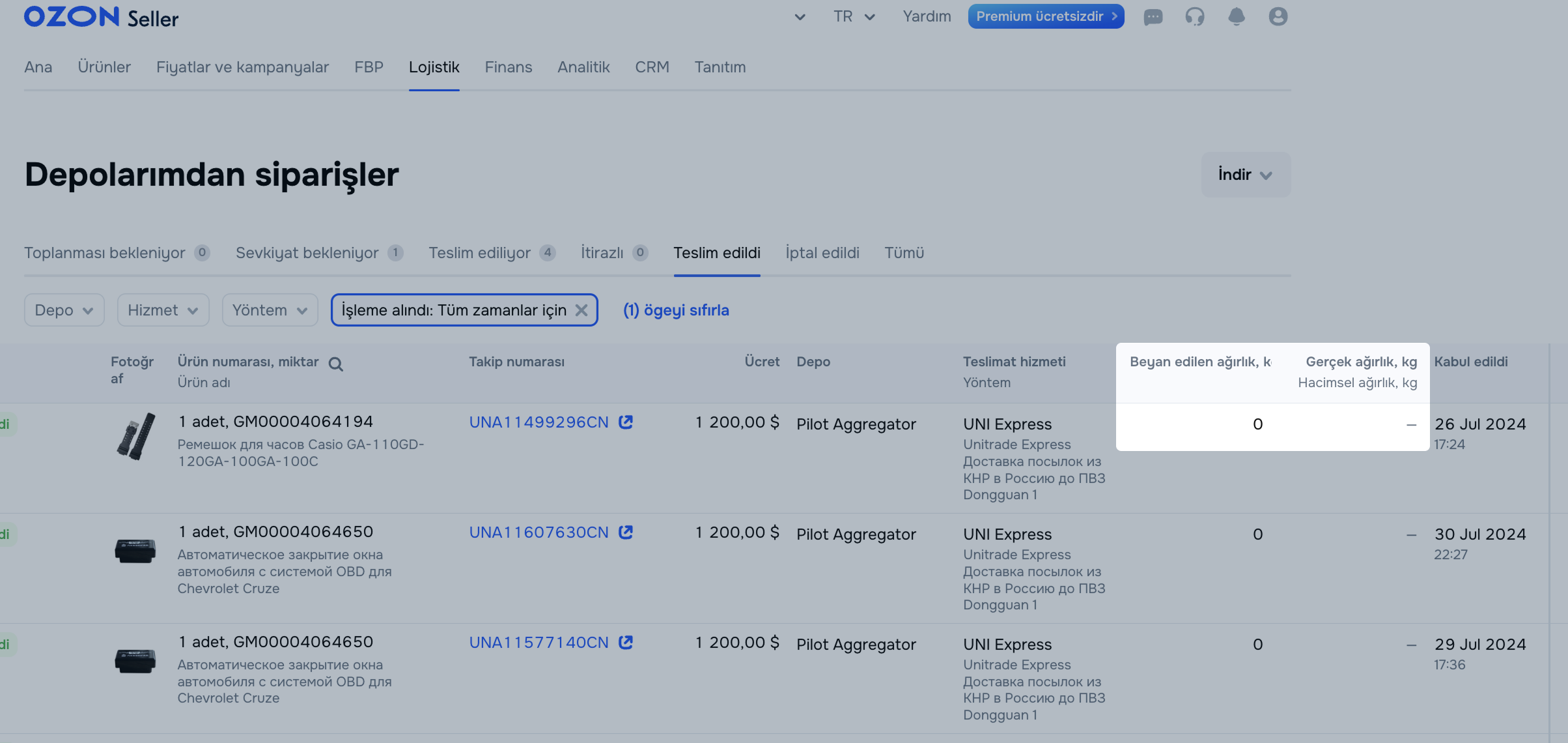 Kişisel hesabınızdaki Lojistik → Depolarımdan siparişler bölümünde ürünlerin, beyan edilen ve gerçek ağırlıkları belirtilmiştir.