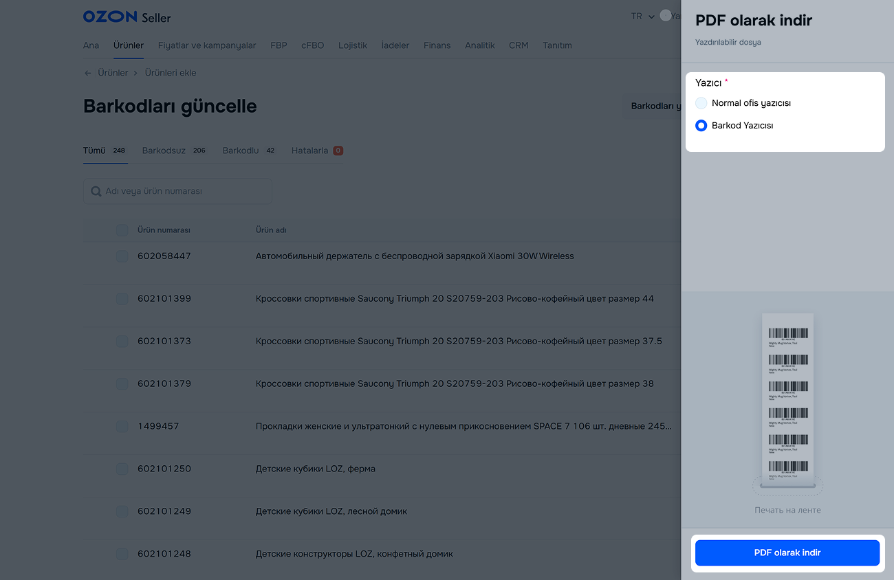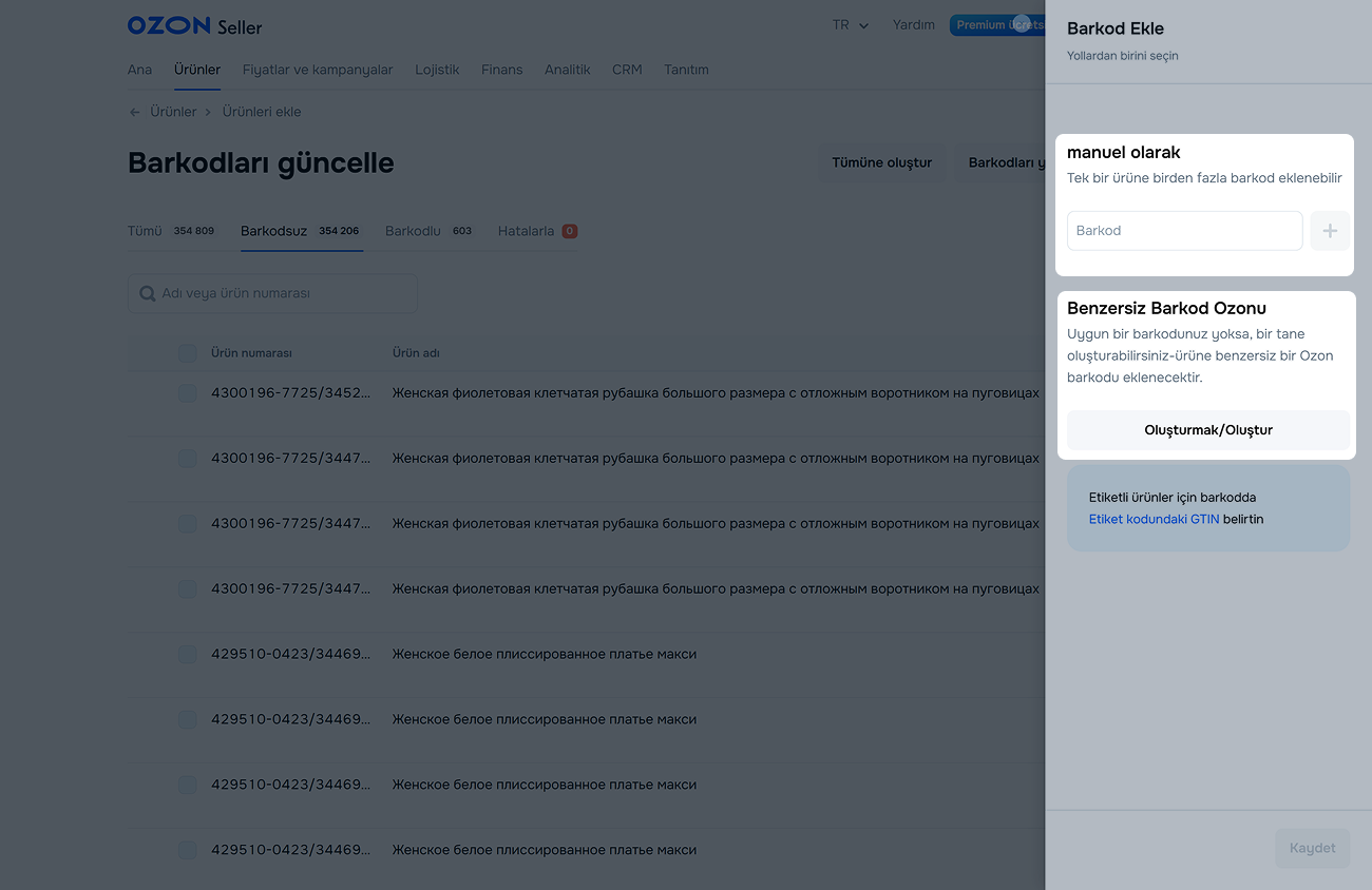 Örnek: Ozon SKU ID kimliği 1234567891 olsun. Sistem OZN1234567891 barkodunu oluşturacaktır.