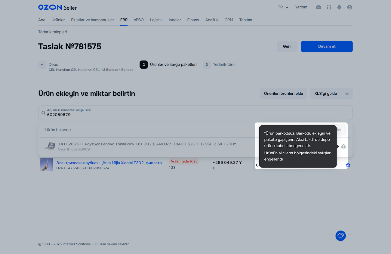 Barkod, paket etiketinin hasar görmesi durumunda ürünü belirlemek için gereklidir. Eğer barkod yoksa ürünün kaybolması durumunda tazminat ödeyemeyiz. 17 Mart 2026’dan itibaren, müşteri siparişi oluşturulurken ürün kartında barkod belirtilmemiş olsa bile sipariş işleme alınacaktır ancak Ozon’un lojistik sürecinde yaşanacak bir kayıp durumunda tazminat ödenmeyecektir.