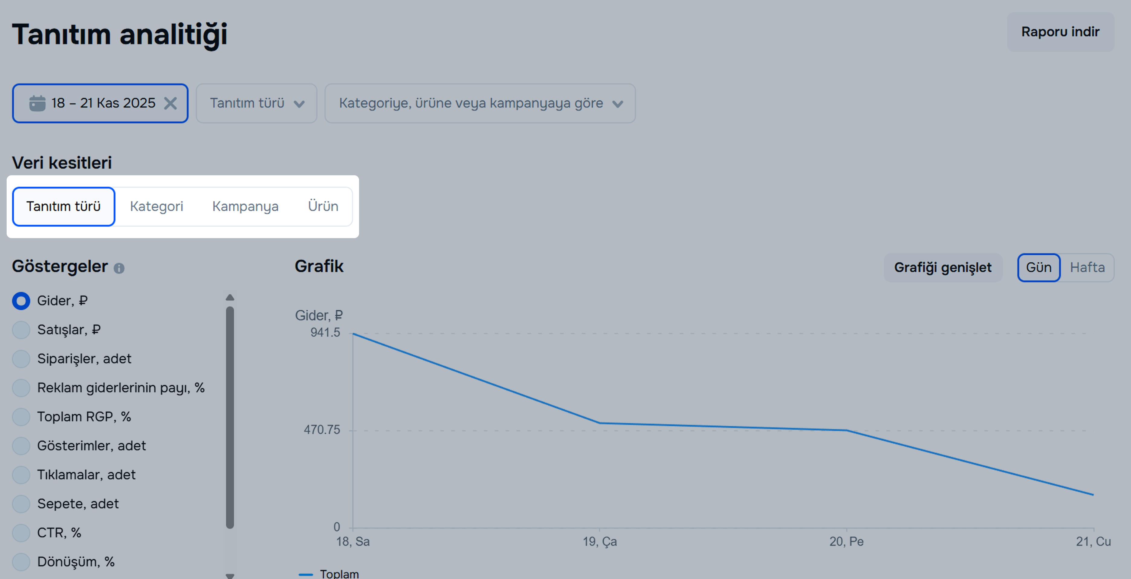 Verileri kategoriye, ürüne veya kampanyaya göre filtreleyin.